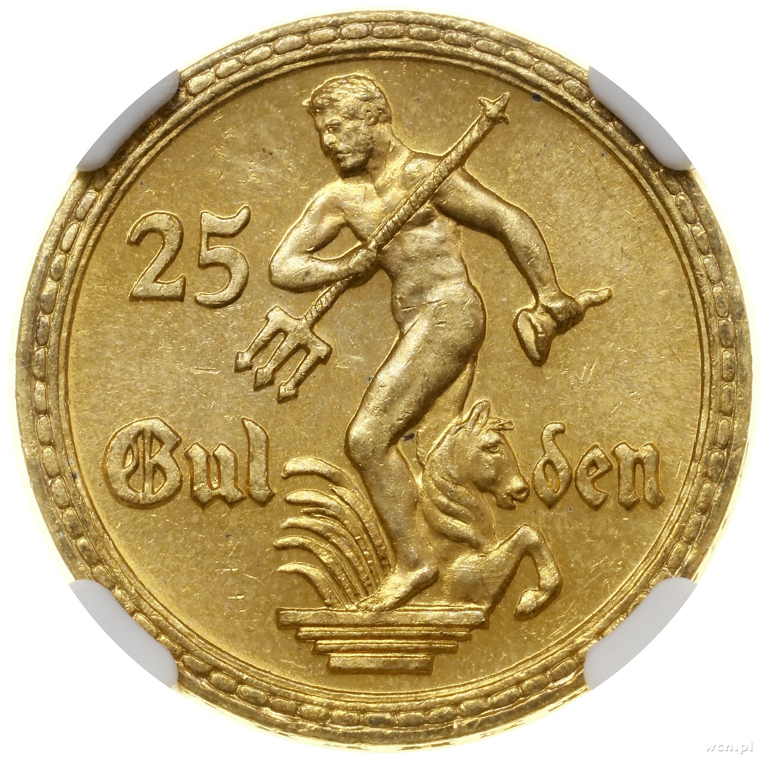 | 327 | Wolne Miasto Gdańsk (1920–1939) 25 guldenów, 1930, Berlin; Posąg Neptuna; CNG 526, Fr. 44, Jaeger D.11, Parchimowicz 71; złoto; pięknie zachowana moneta wybita w nakładzie 4.000 egzemplarzy, w pudeł.. |