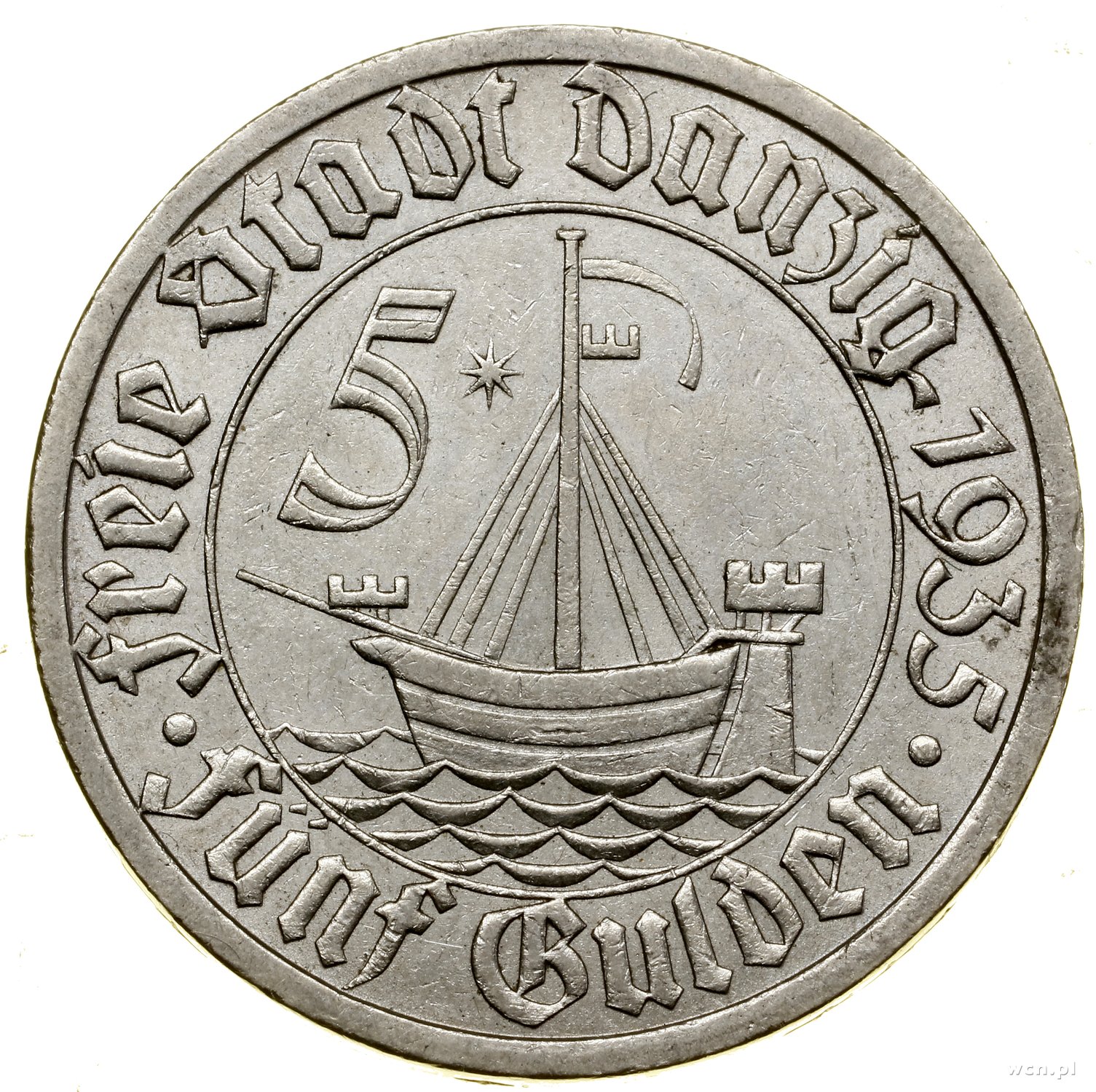 | 328 | Wolne Miasto Gdańsk (1920–1939) 5 guldenów, 1935, Berlin; Koga; AKS 11, CNG 523, Jaeger D.19, Parchimowicz 68; bardzo ładnie zachowana moneta. |