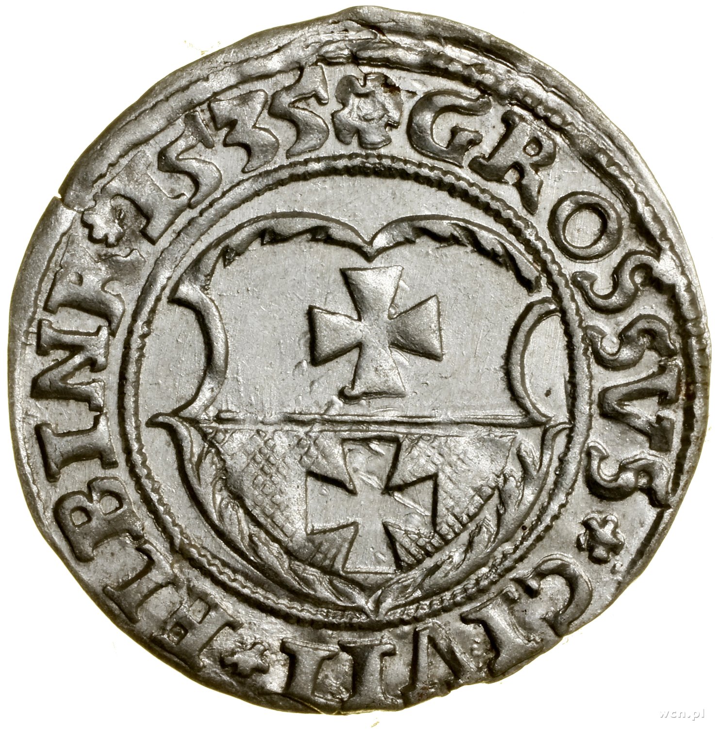 | 155 | Zygmunt I Stary (1506–1548) / monety pruskie Grosz, 1533, Toruń; końcówki legend PRVSS / PRVSS; Białk.-Szw. 86, CNCT 1251, Kop. 3088, Kurp. (1506–1573) 316 (R), PN2-Dut. 87, bardzo ładnie zachowany. |