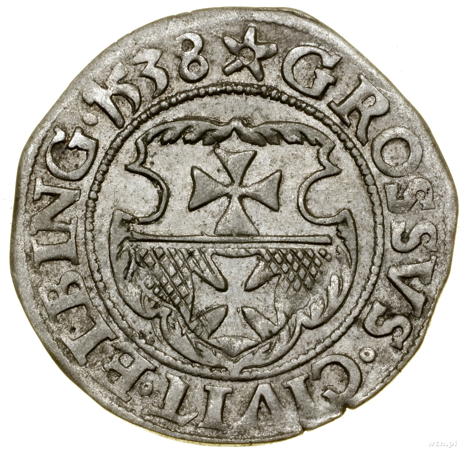 | 148 | Zygmunt I Stary (1506–1548) / miasto Elbląg Grosz, 1538, Elbląg; Białk.-Szw. 256 (R2), CNCE 181 (R5), H-Cz. 387, Kop. 7083 (R7), Kurp. (1506–1573) 602 (R4), Pfau 130, PN2-Dut. 139 (R4), Slg. Marienburg 9247, Ty.. |