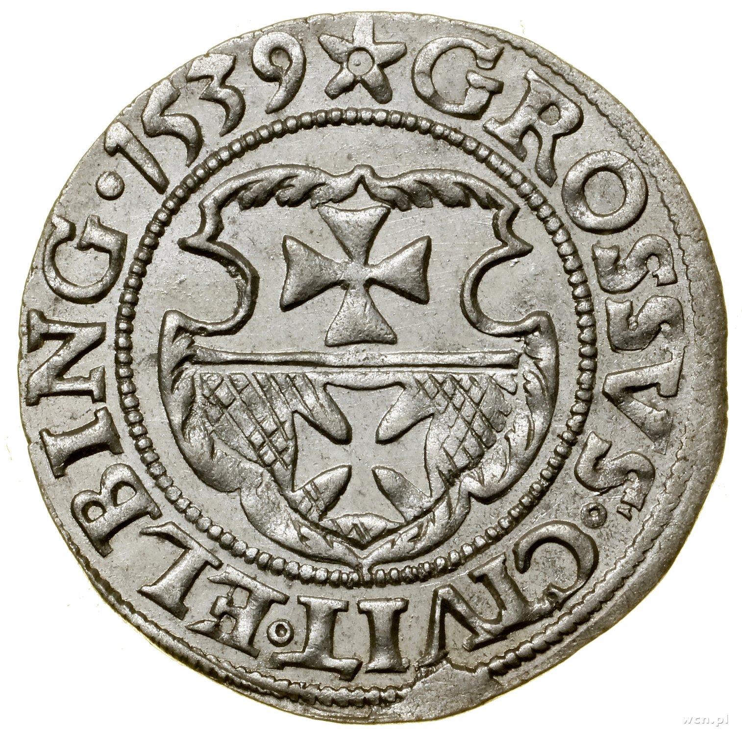 | 149 | Zygmunt I Stary (1506–1548) / miasto Elbląg Grosz, 1539, Elbląg; miecz z prawej strony, w legendzie awersu PRVS; Białk.-Szw. 258, CNCE 182 (R3), Kop. 7085 (R2), Kurp. (1506–73) 603 (R), Pfau 131, PN2-Dut. 140; .. |