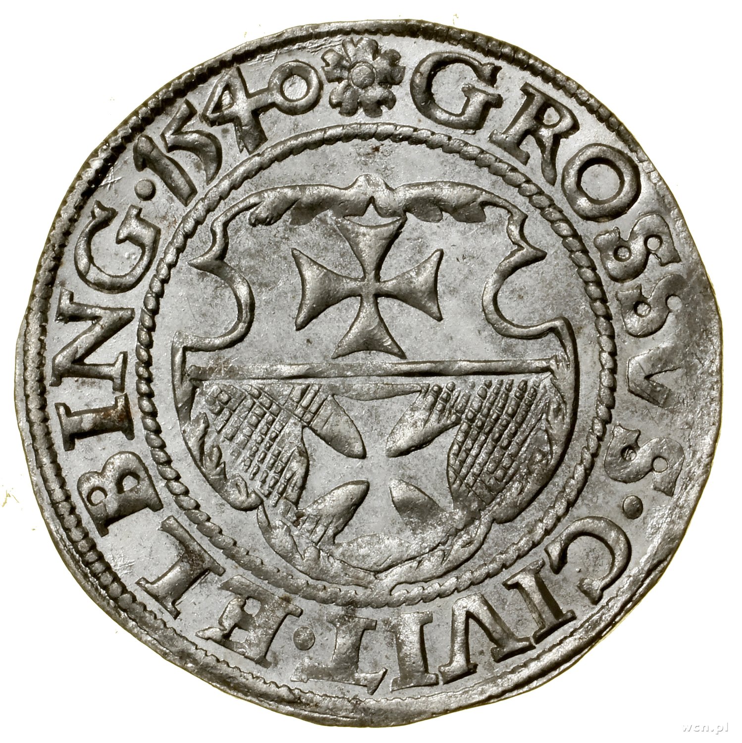 | 150 | Zygmunt I Stary (1506–1548) / miasto Elbląg Grosz, 1540, Elbląg; w legendzie awersu PRVSS; Białk.-Szw. 260, CNCE 194 (R2), Kop. 7086, Kurp. (1506-73) 609 (R), Pfau 139, PN2-Dut. 148; wyraźnie wybity, pięknie za.. |