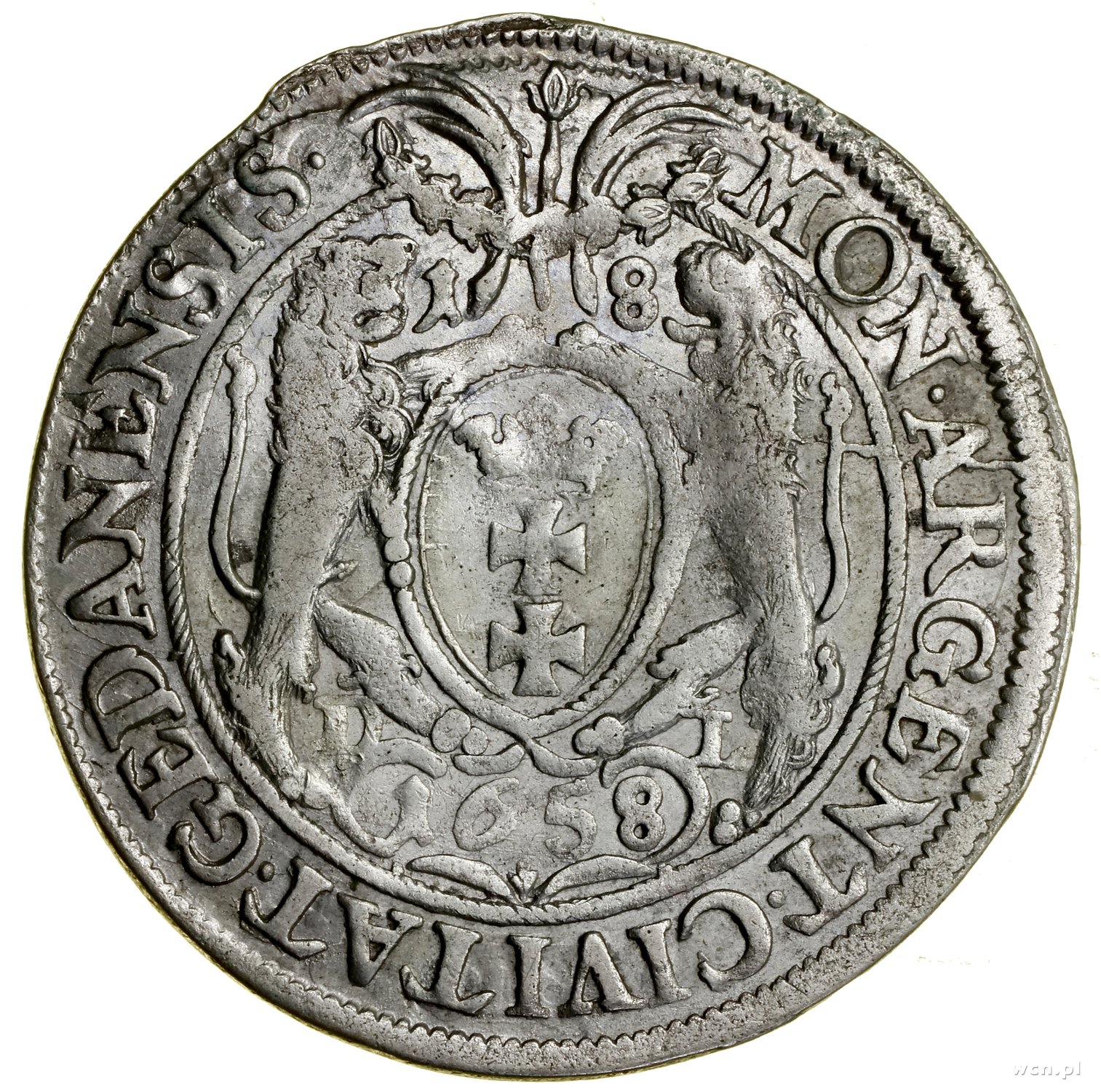 | 217 | Jan II Kazimierz (1649–1668) / miasto Gdańsk Ort, 1658, Gdańsk; wariant z wąskim popiersiem władcy, w legendzie awersu IOH, w legendzie rewersu GEDANSENSIS, inicjały D - L (dzierżawca mennicy Daniel Lesse) przy .. |
