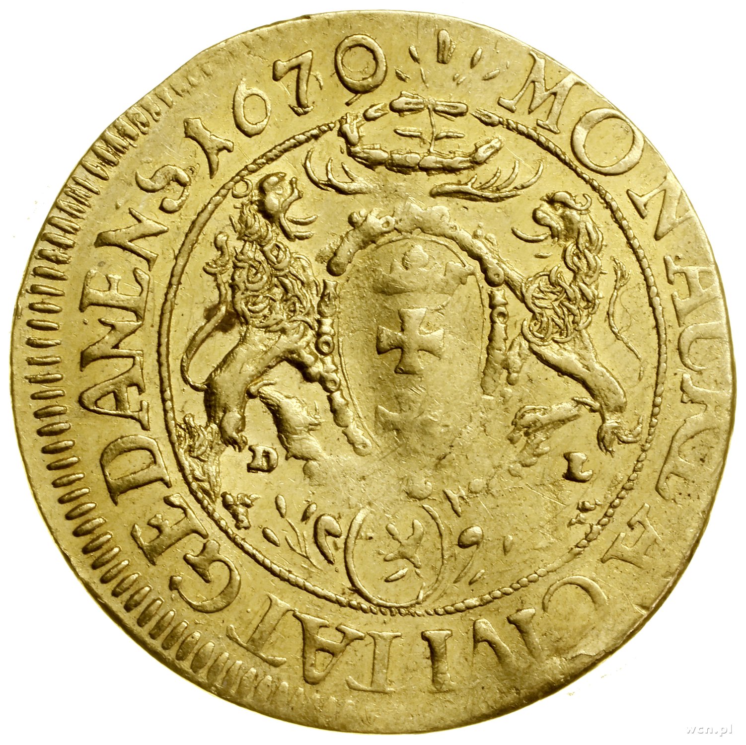 | 225 | Michał Korybut Wiśniowiecki (1669–1673) / miasto Gdańsk Dukat, 1670, Gdańsk; data przebita z roku 1669; Aw: Popiersie króla w prawo, MICHAEL D G REX POL M D L RUS PRUS; Rw: Herb Wielki miasta Gdańska, poniżej inicjały D - .. |