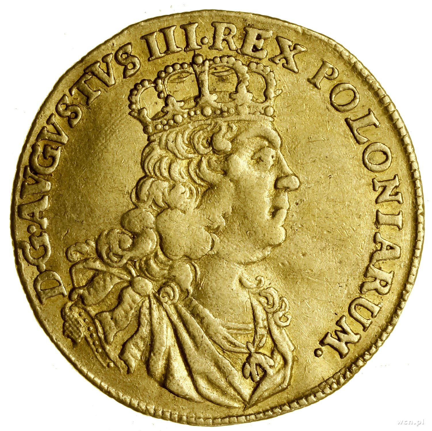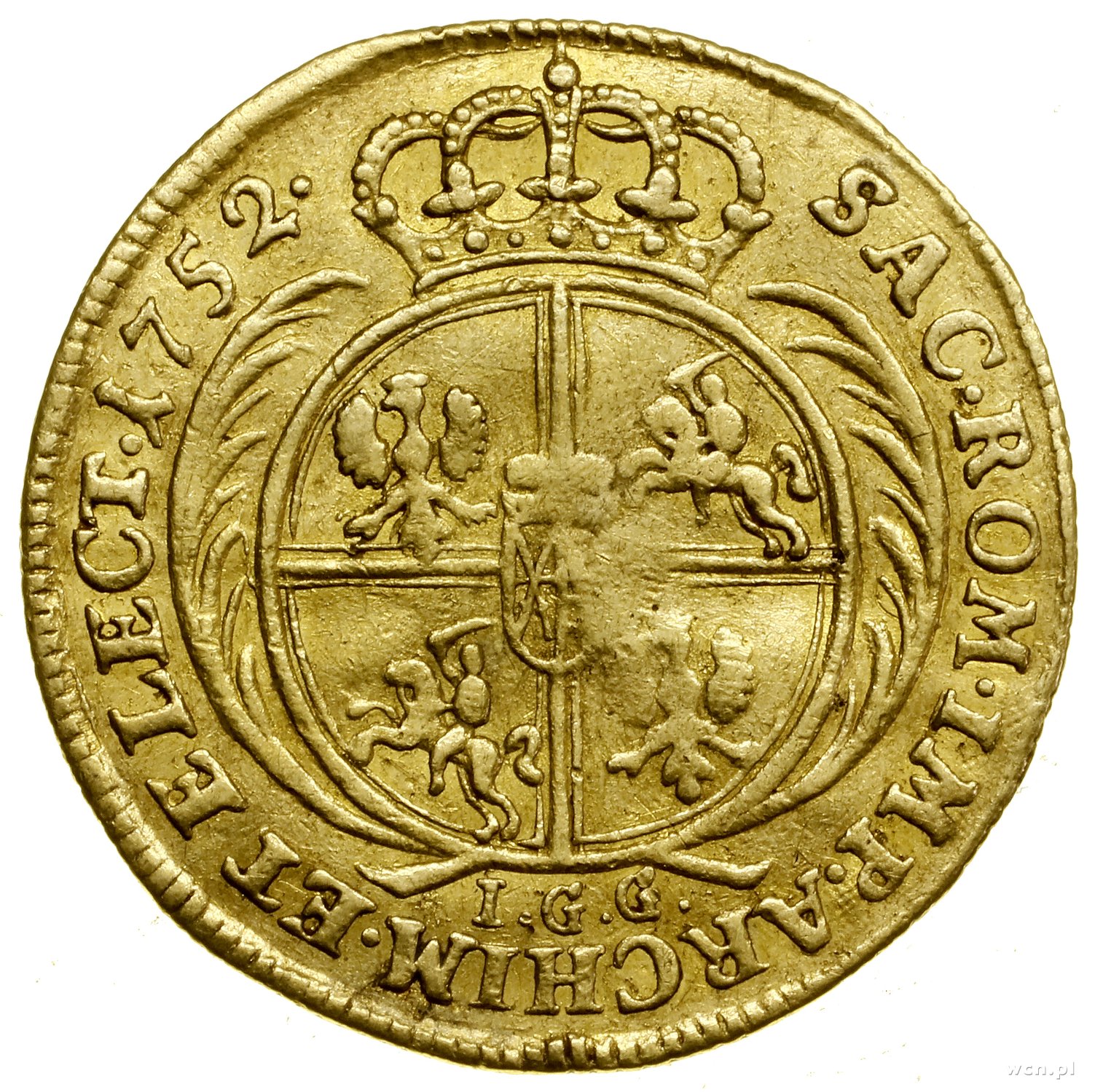 Dukat, 1752, Lipsk; Aw: Popiersie króla w zbroi i koronie w prawo, D G AVGVSTVS III REX POLONIARUM; Rw: Ukoronowana i ozdobiona pięciopolowa tarcza herbowa, poniżej i..