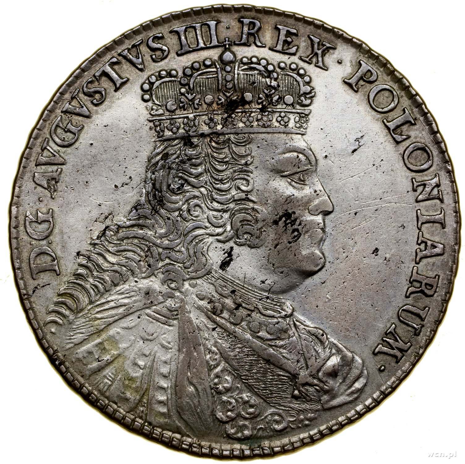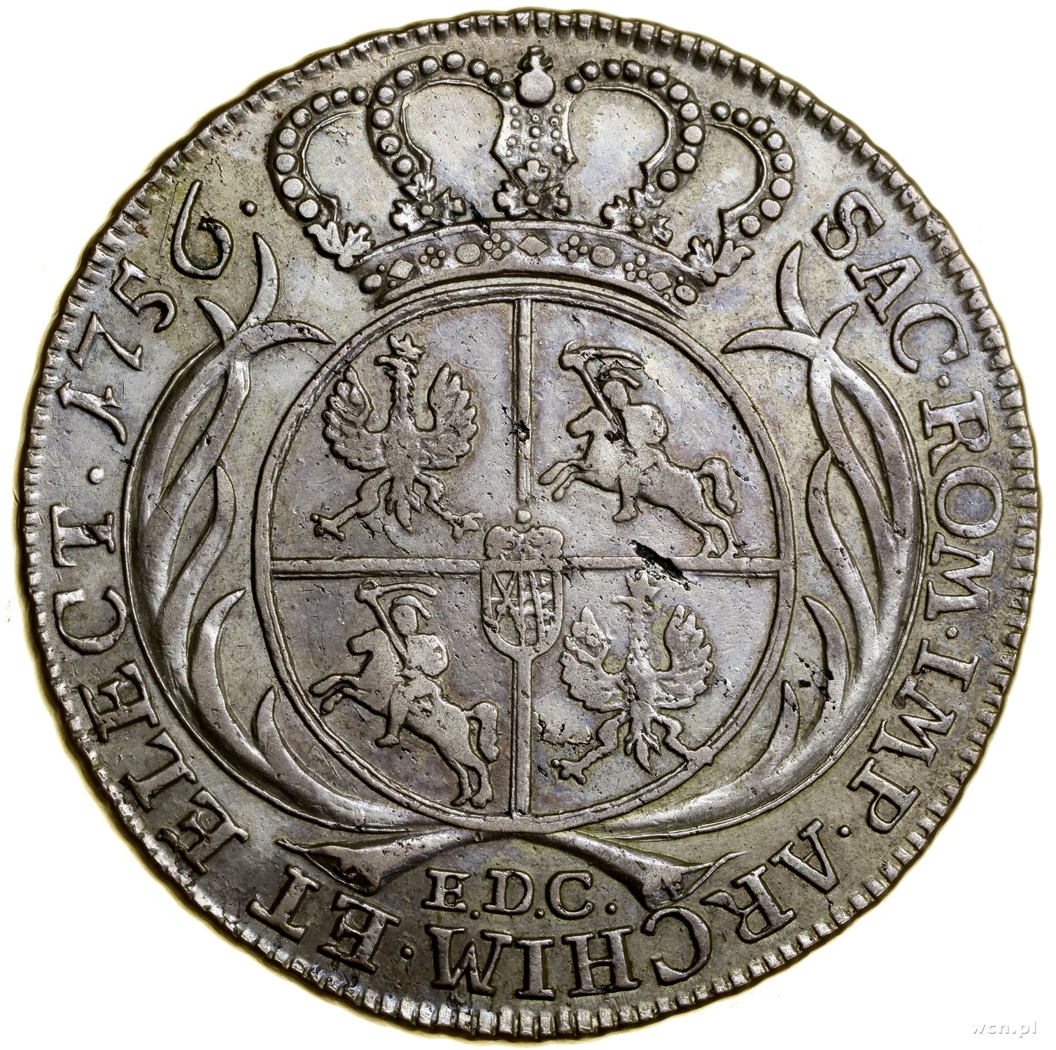 Talar, 1756, Lipsk; Aw: Popiersie króla w prawo, D G AVGVSTVS III REX POLONIARUM; Rw: Ukoronowana, ozdobiona pięciopolowa tarcza herbowa, poniżej inicjały E D C (minc..
