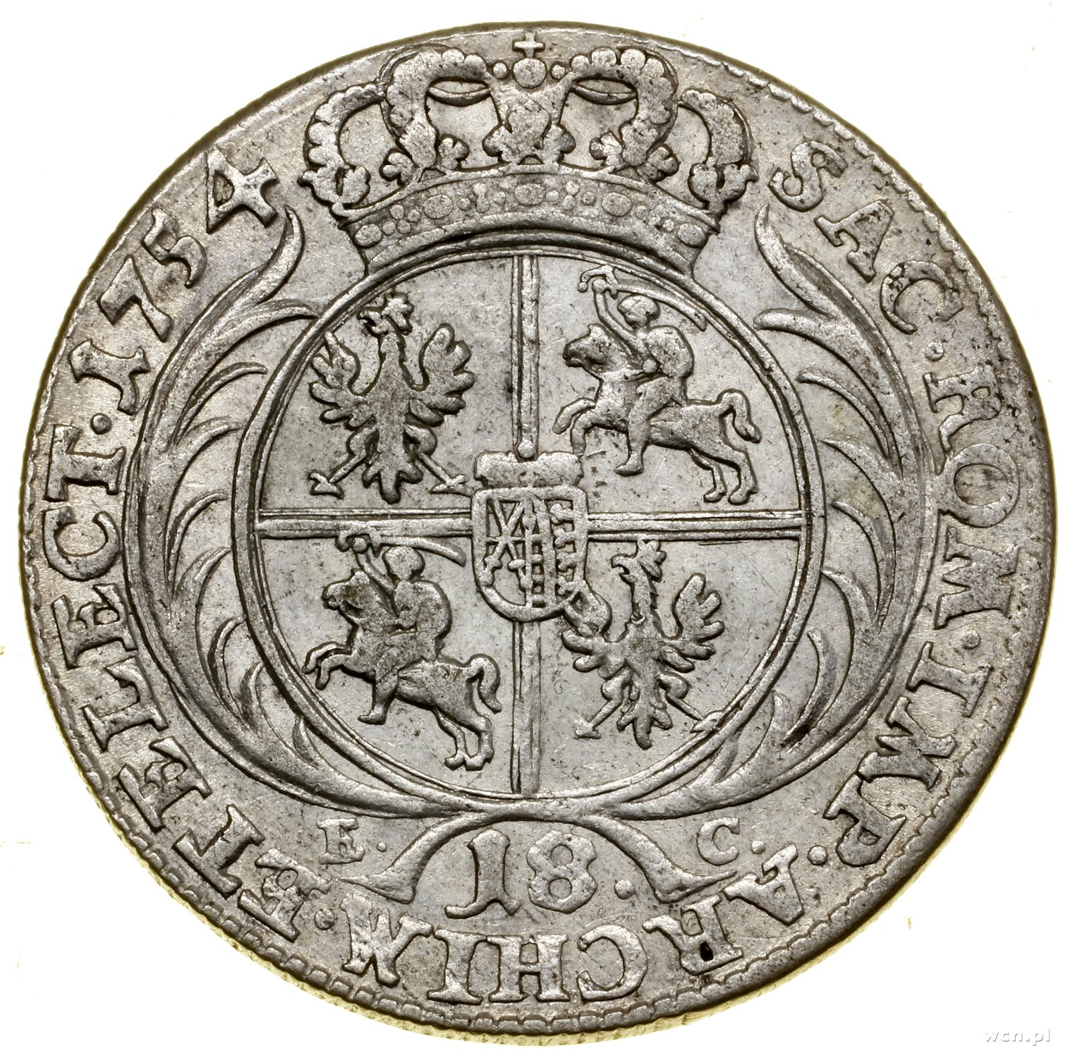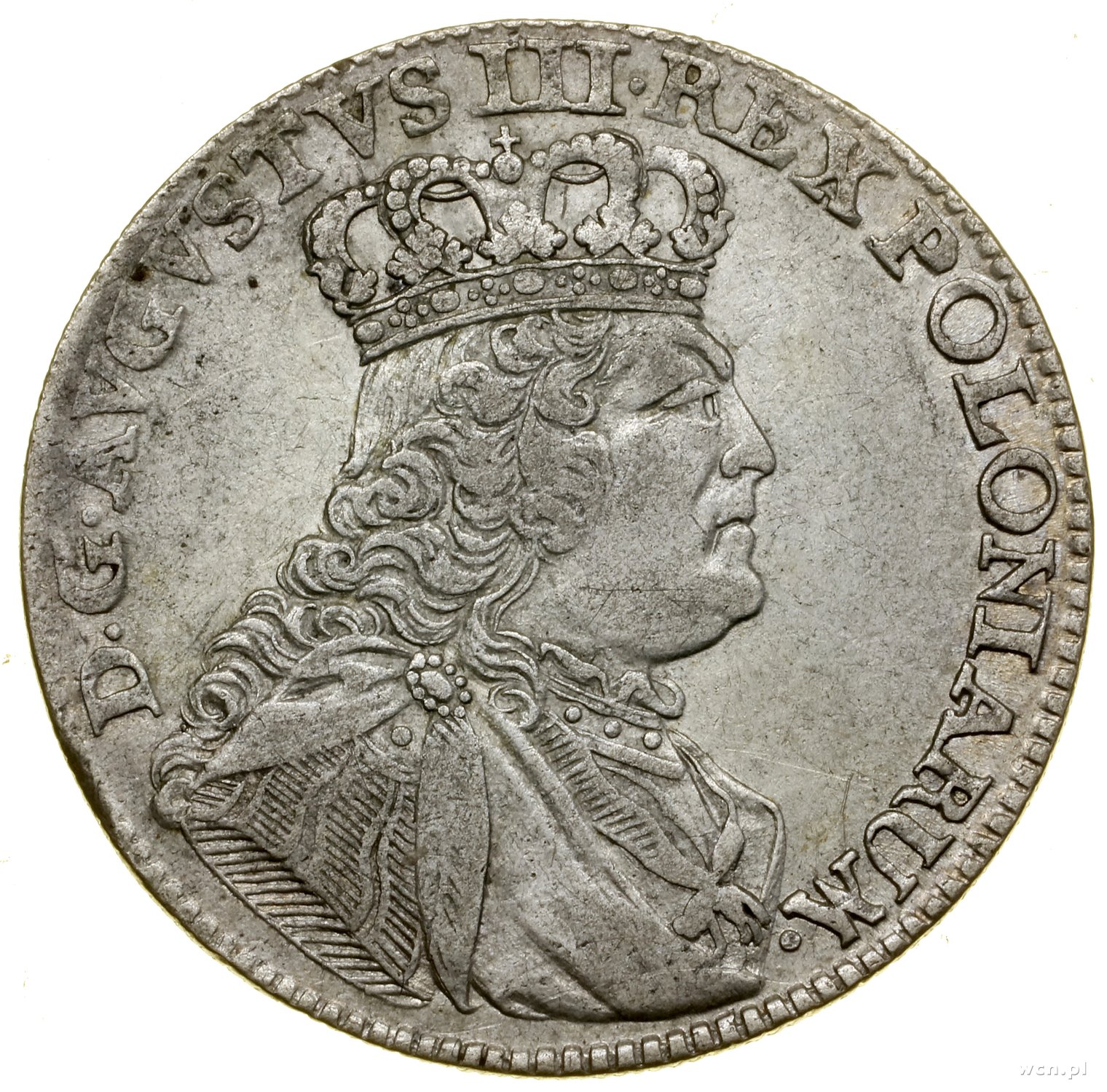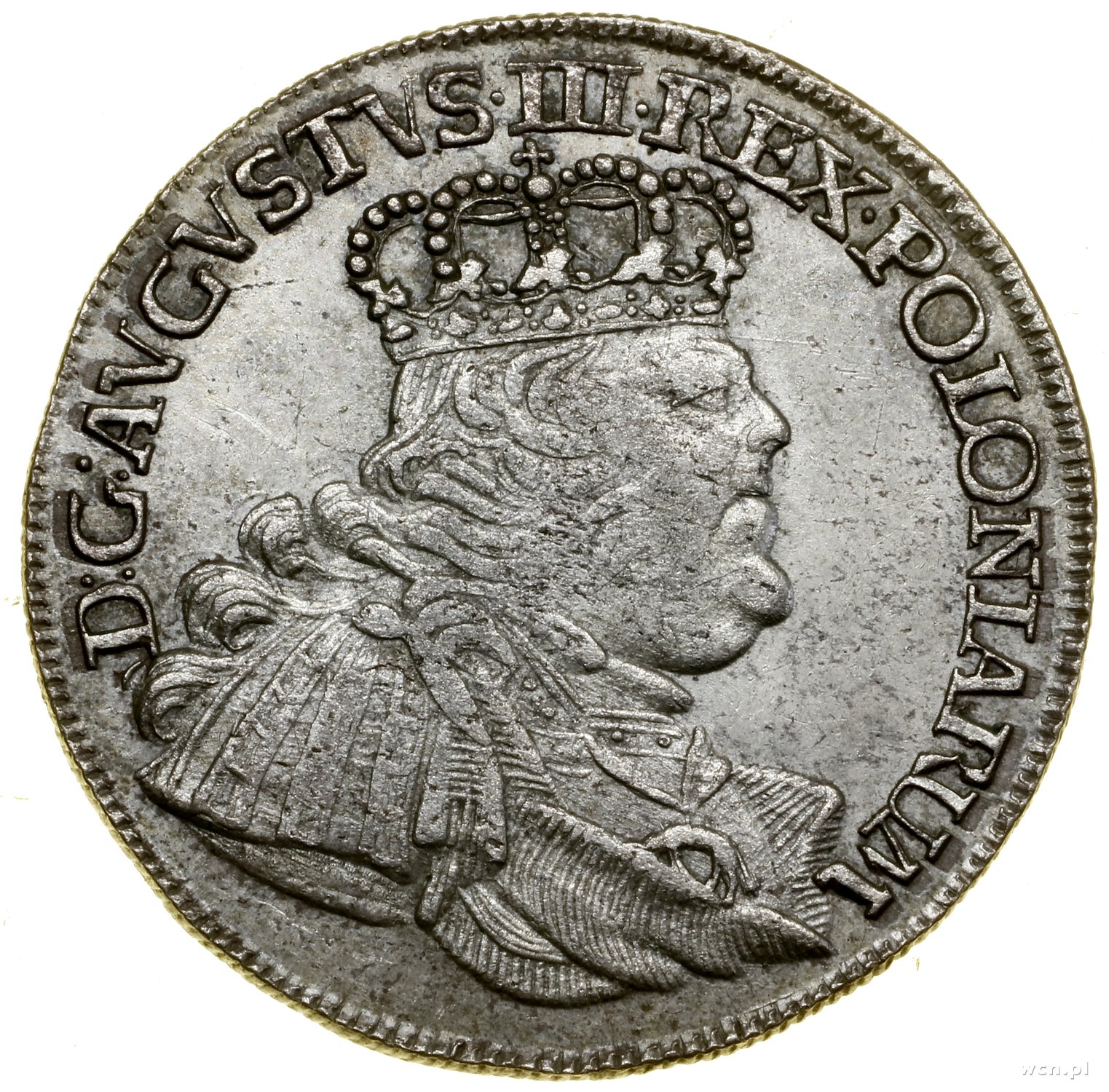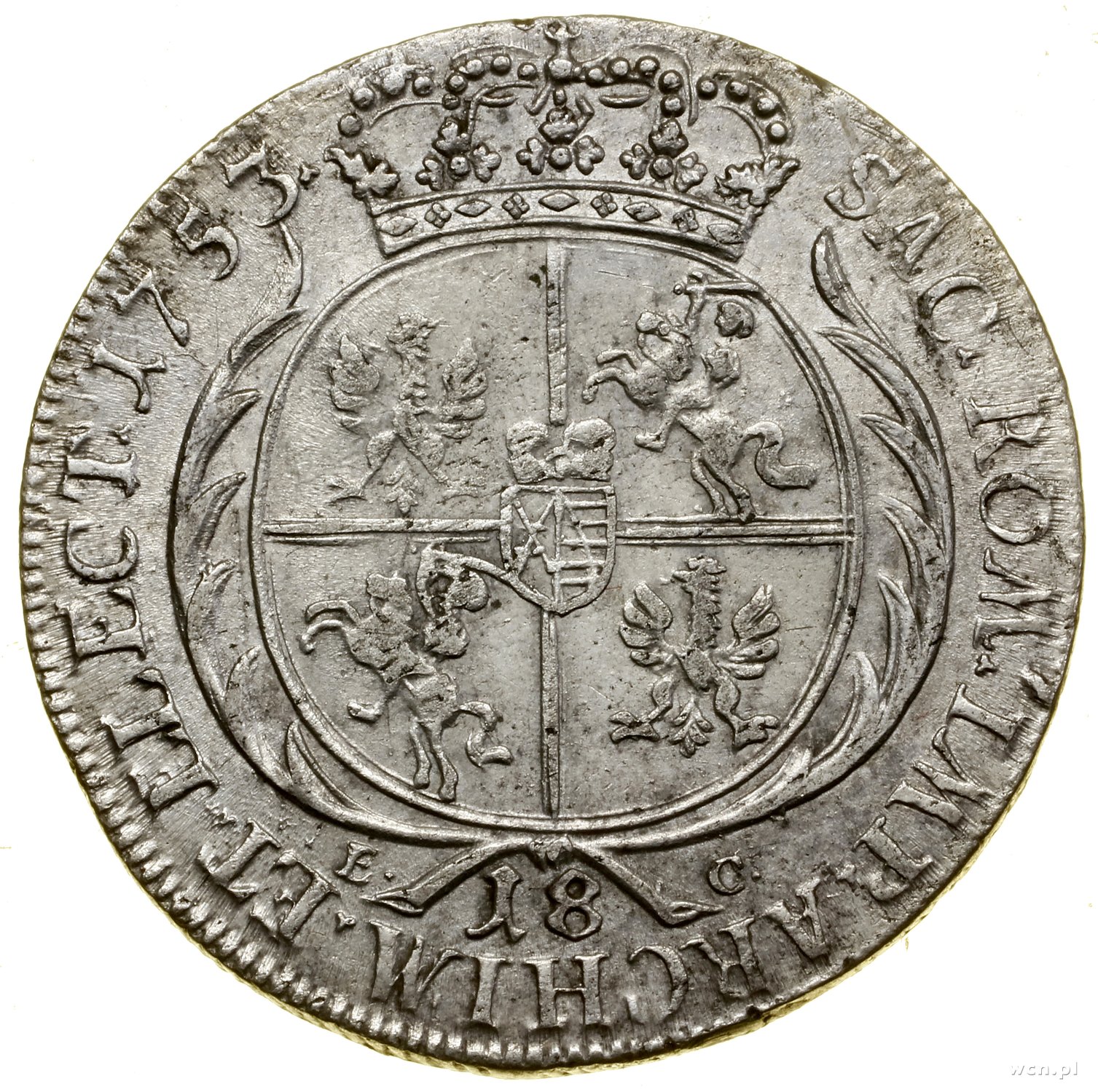 Dwuzłotówka (8 groszy), 1753, Lipsk; masywne popiersie króla, rzadka odmiana z inicjałami E - C (mincmistrz Ernest Ditrych Croll) i napisem 8 GR pod tarczą herbową na..