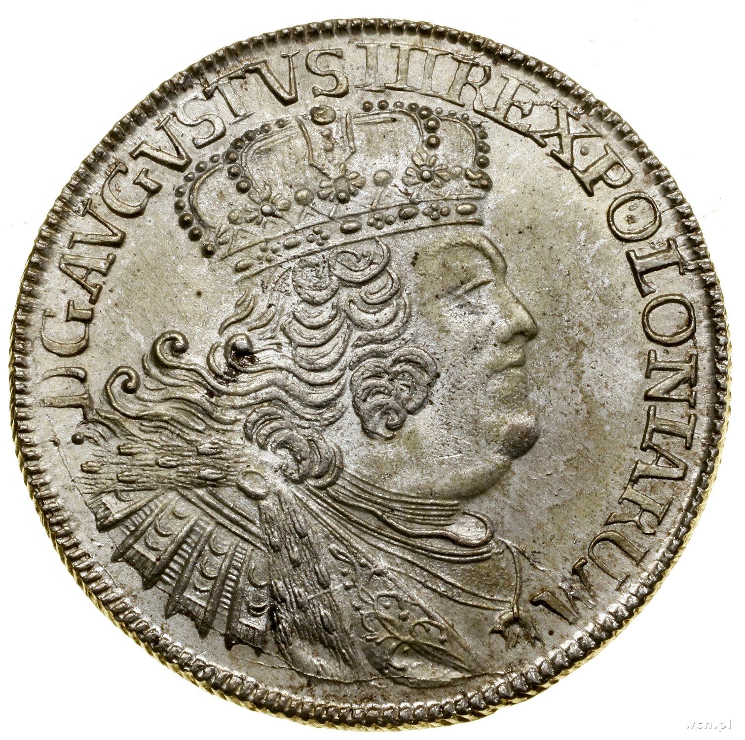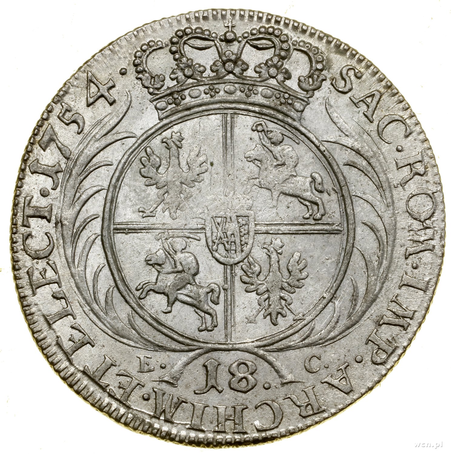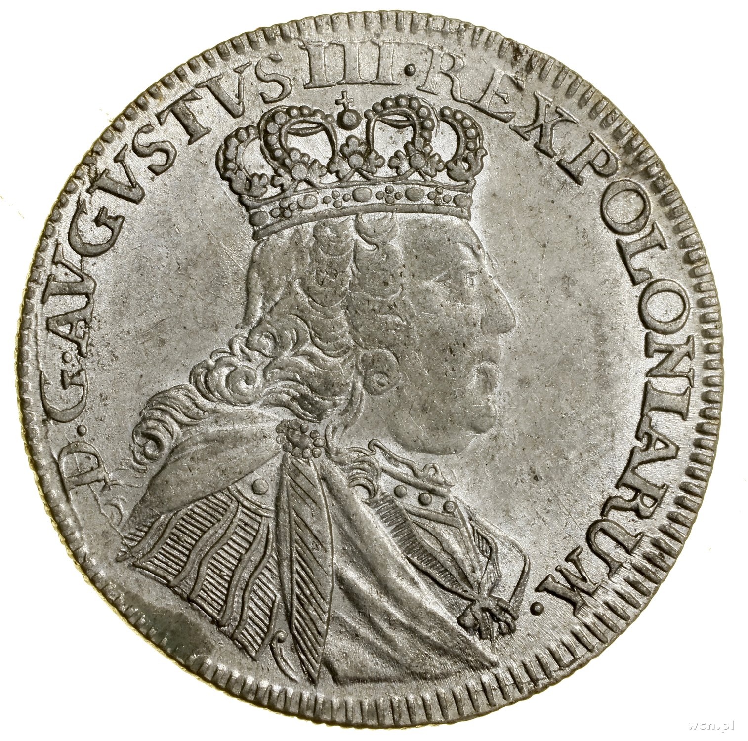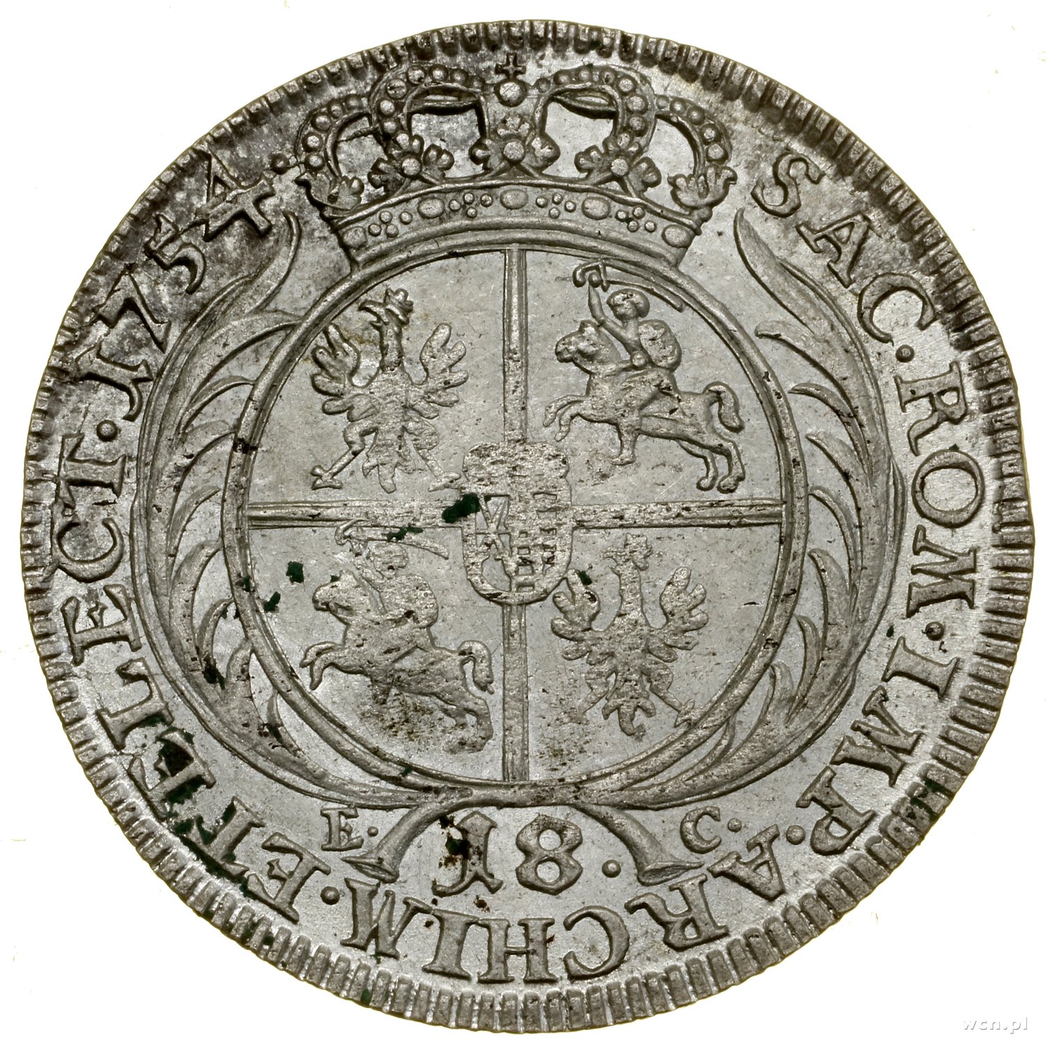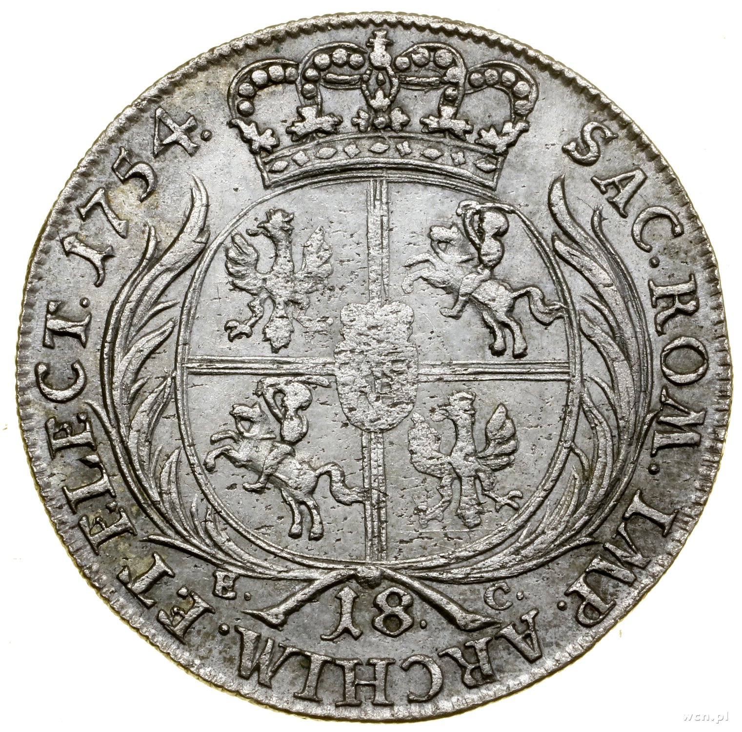 Dwuzłotówka (8 groszy), 1753, Lipsk; masywne popiersie króla, rzadka odmiana z inicjałami E - C (mincmistrz Ernest Ditrych Croll) i napisem 8 GR pod tarczą herbową na..