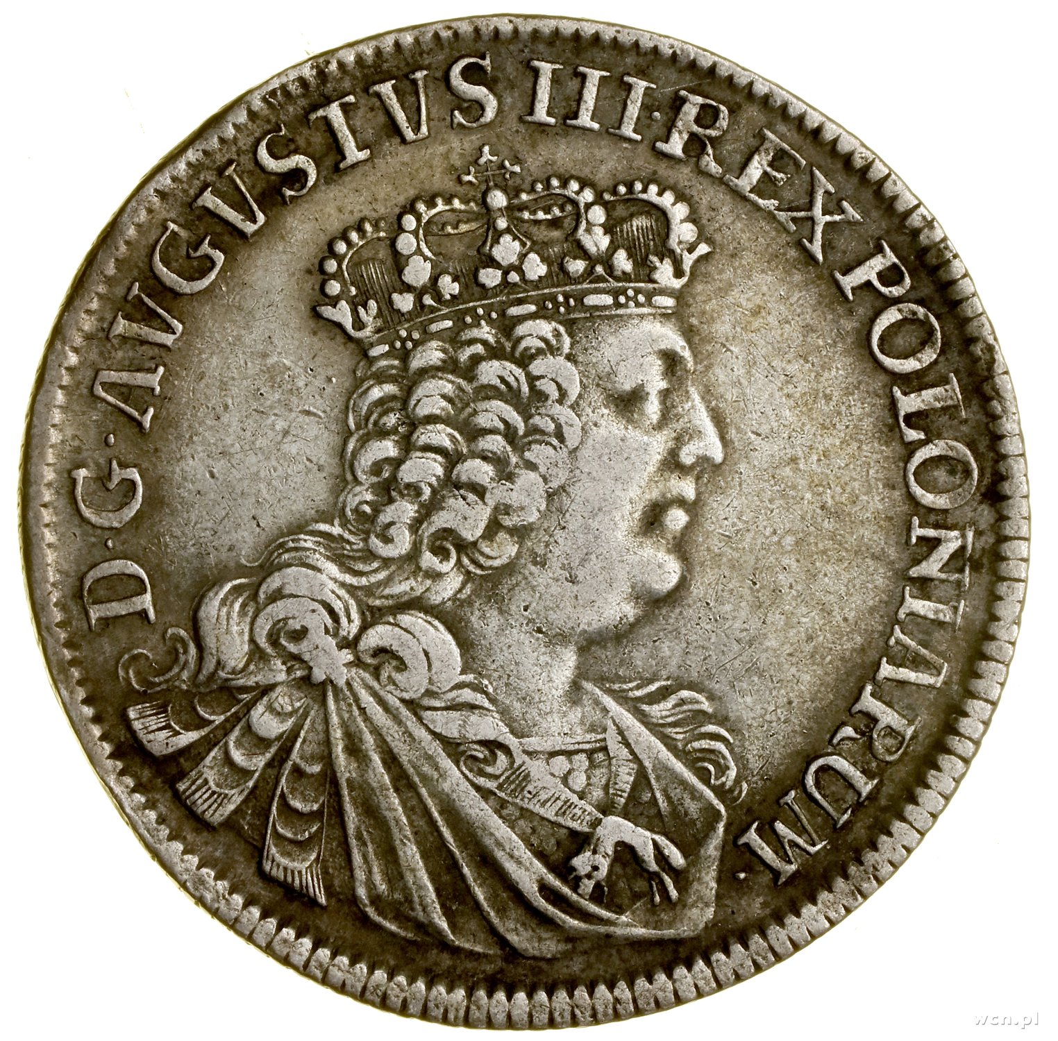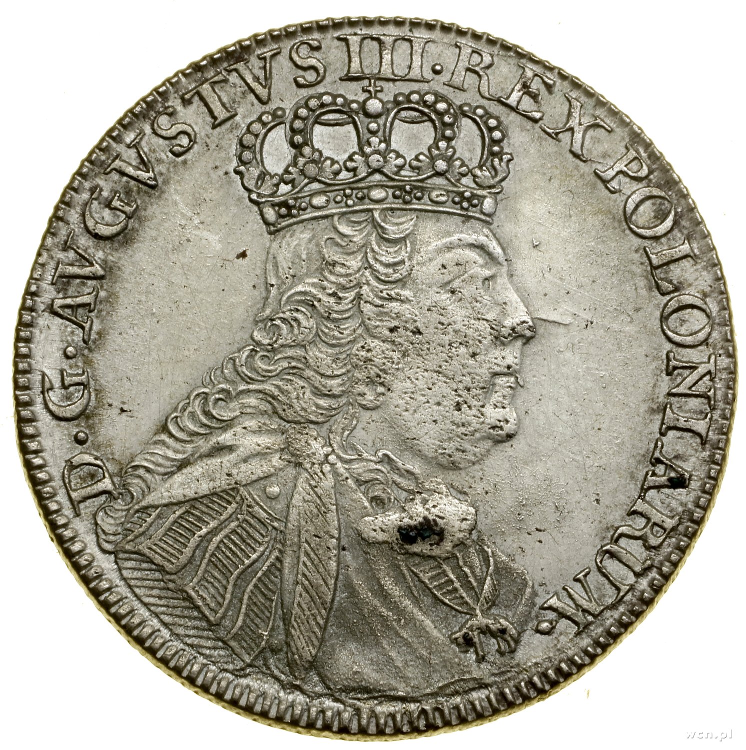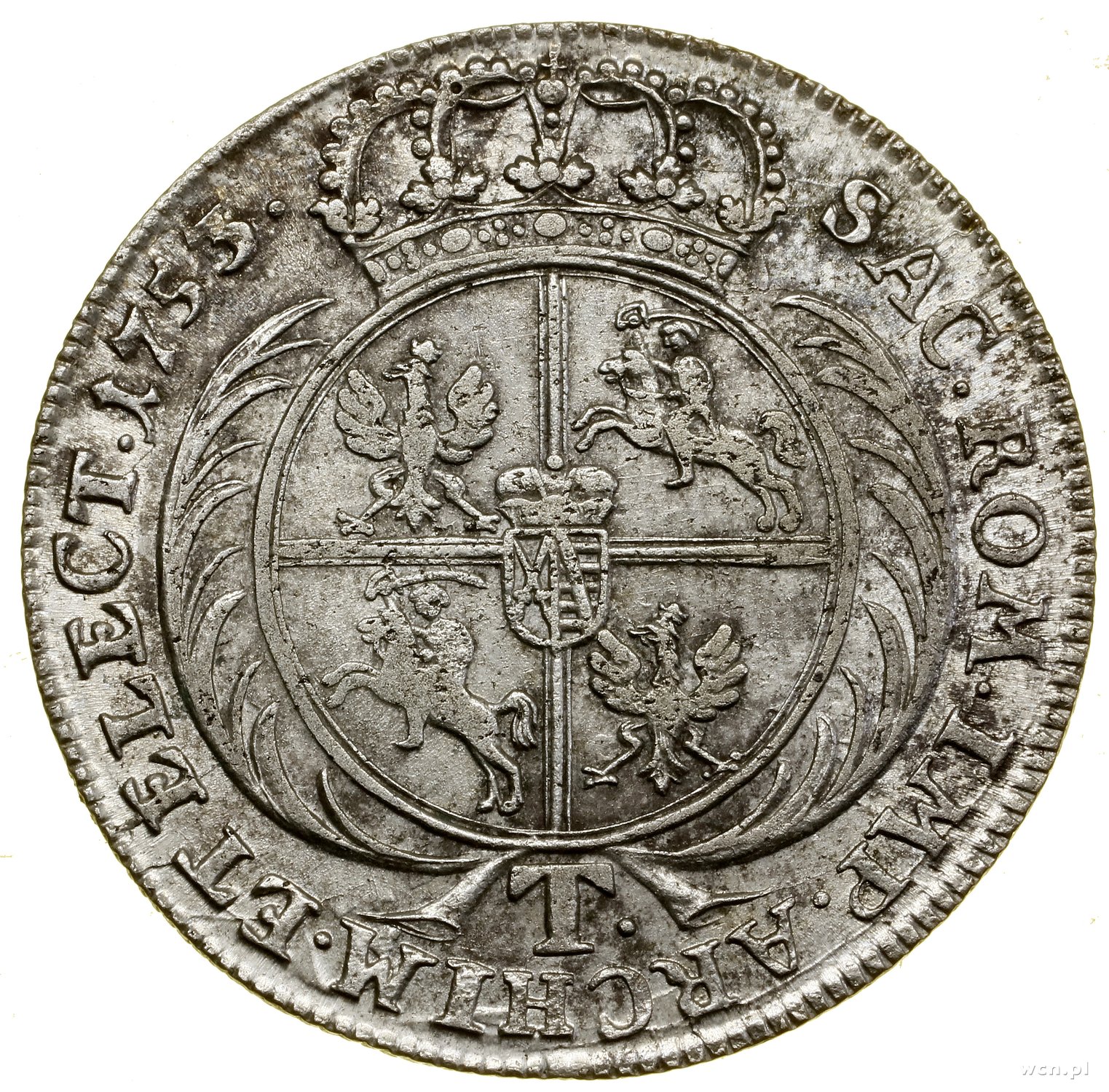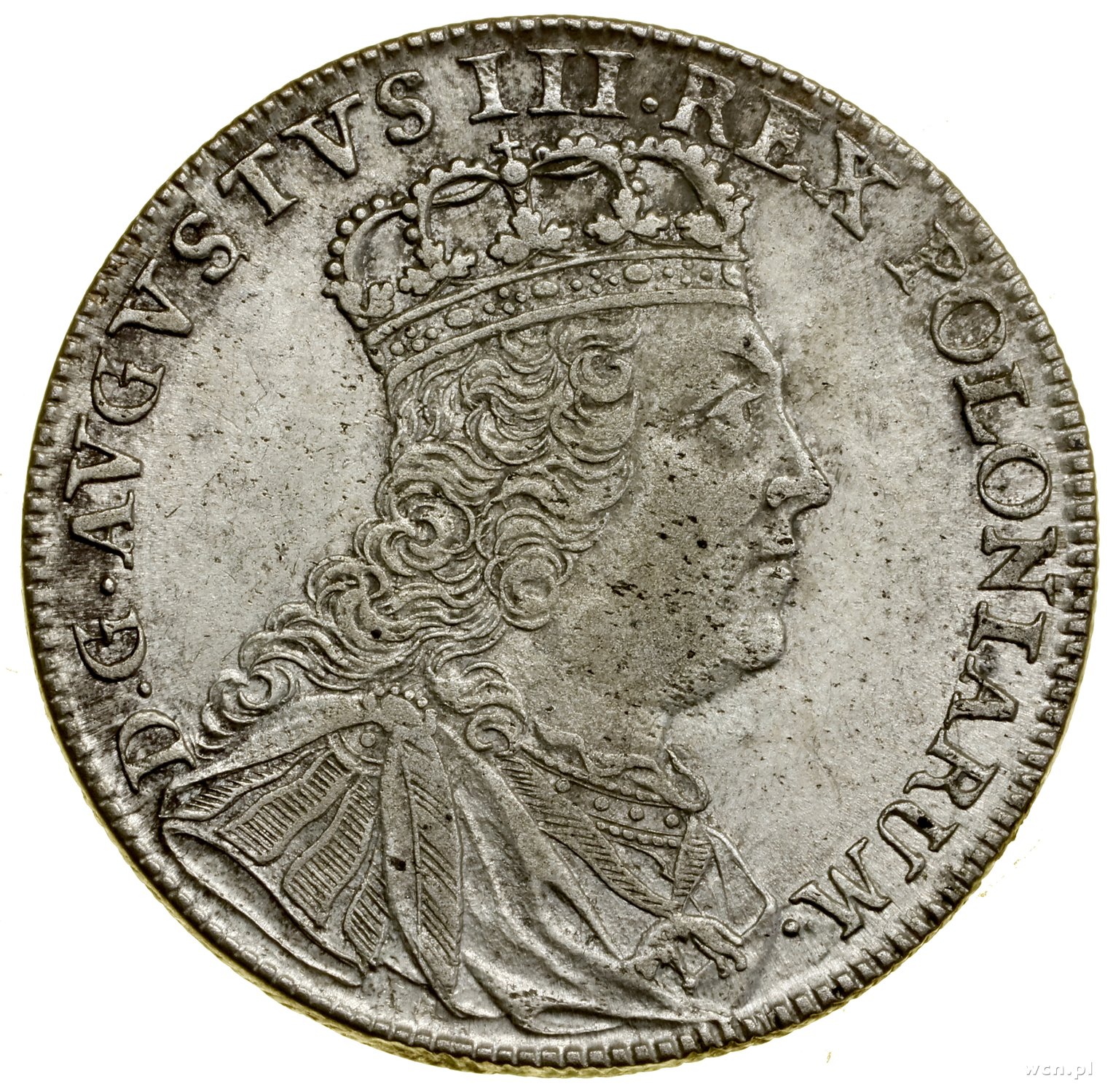 Dwuzłotówka (8 groszy), 1753, Lipsk; masywne popiersie króla, rzadka odmiana z inicjałami E - C (mincmistrz Ernest Ditrych Croll) i napisem 8 GR pod tarczą herbową na..