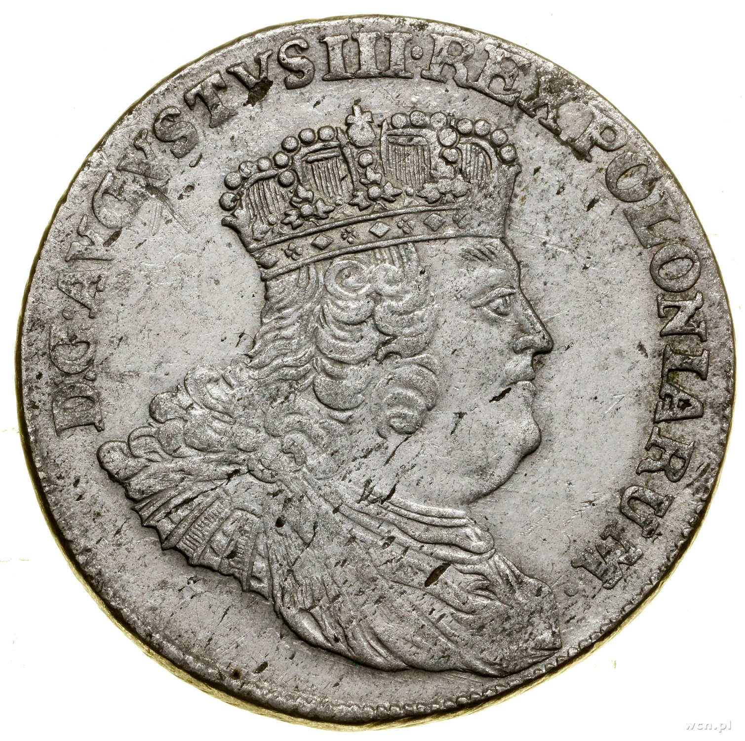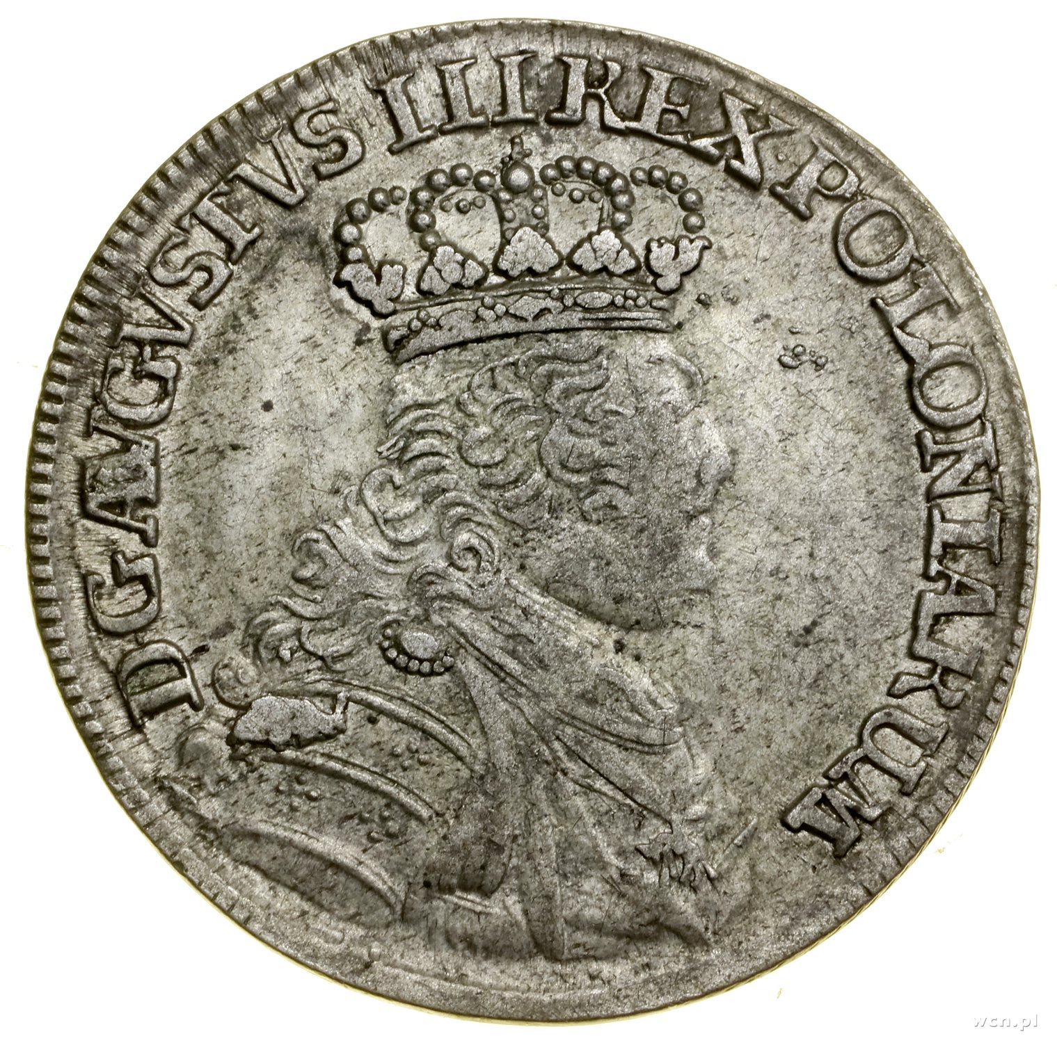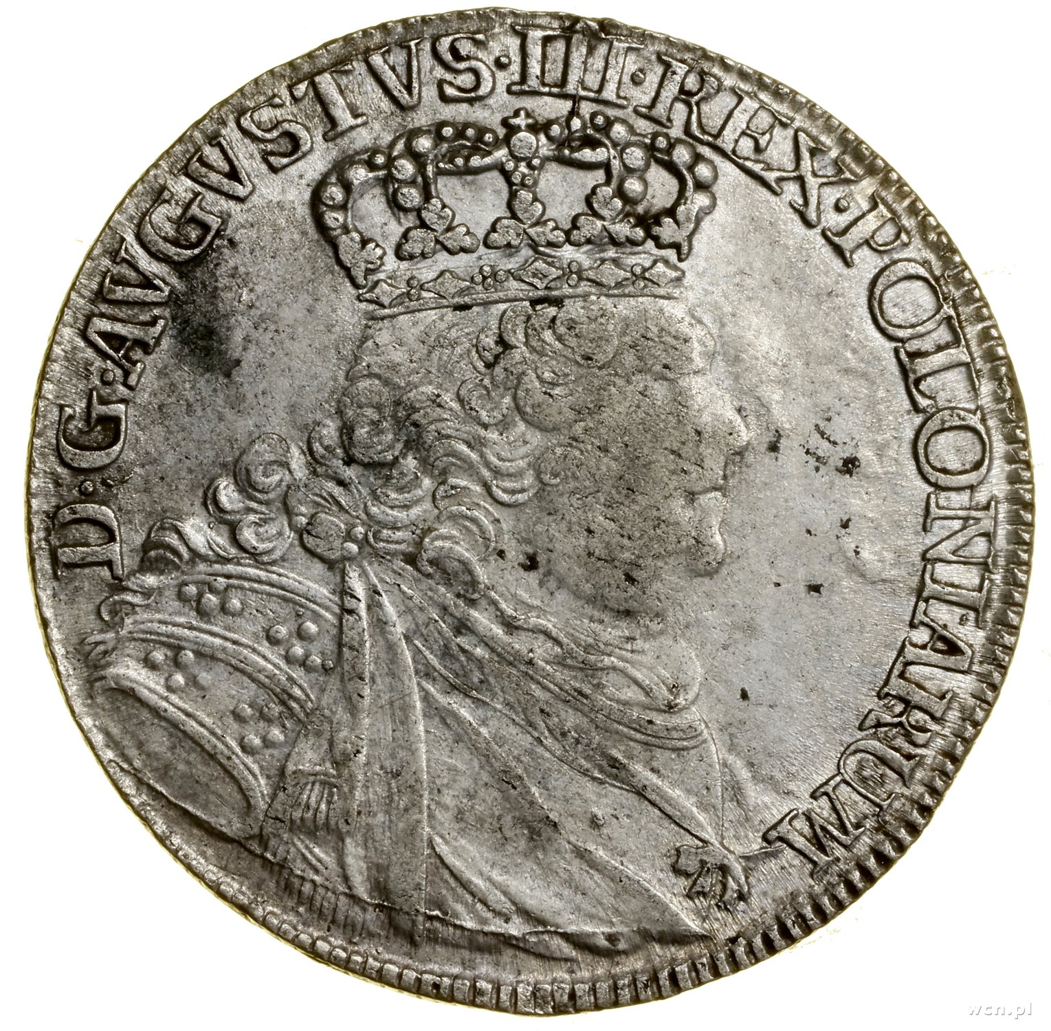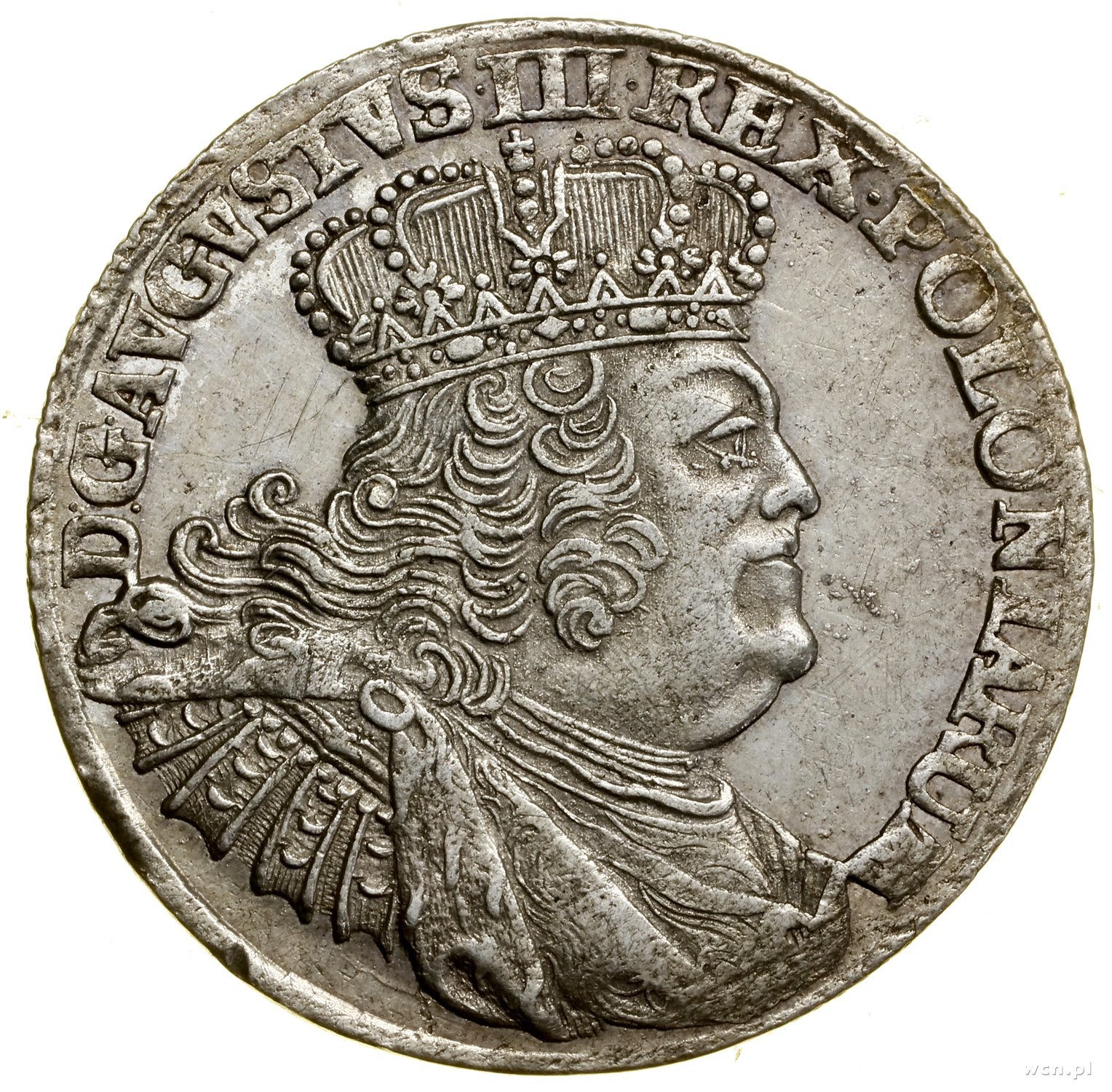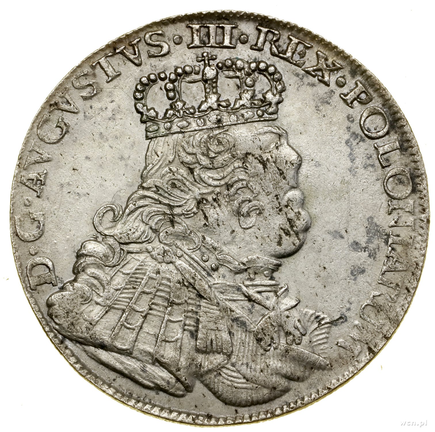 Dwuzłotówka (8 groszy), 1753, Lipsk; wąskie popiersie króla, rzadki wariant z napisem 8 gr pod tarczą herbową na rewersie; Kahnt 681 var. a, Kop. 2118 (R2), Kurp. (16..