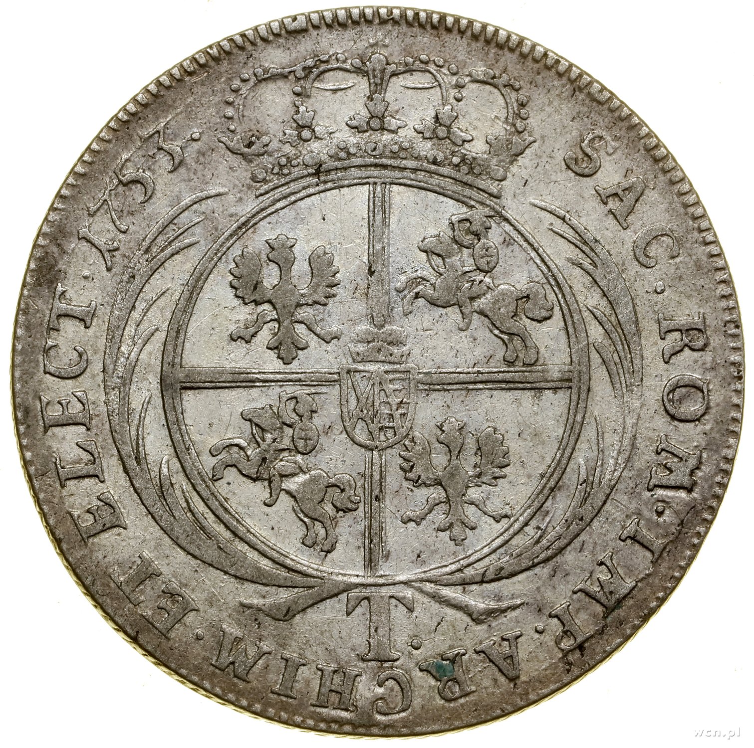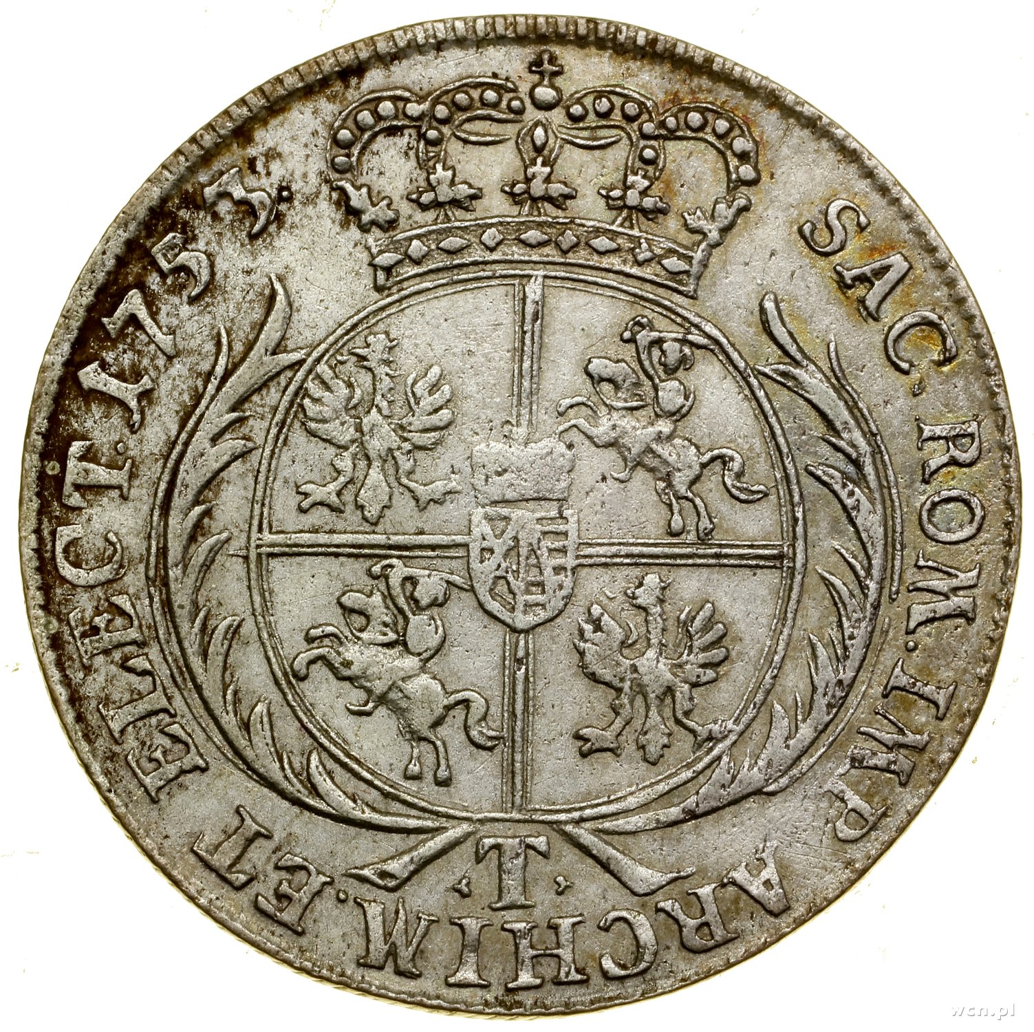 Tymf, 1753, Lipsk; typ portretowy „zadarty nos”, przekrój ramienia osełkowaty, skośnie żeberkowany, litera S (mincerz Johann Friedrich Stieler) pod ramieniem władcy, ..