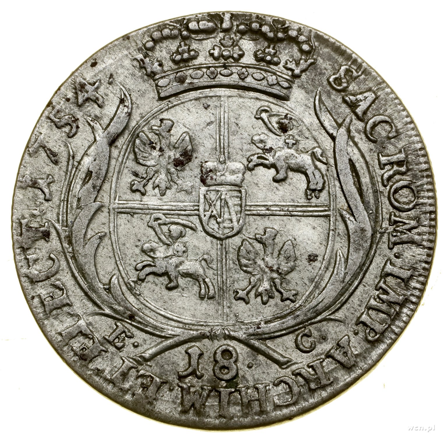 Ort, 1754 EC, Lipsk; krawędź wyłogu płaszcza układa się w „Z”, brosza zapony owalna, w linijnej półobwódce, pola korony gładkie z linijnymi podwieszeniami, na rewersi..