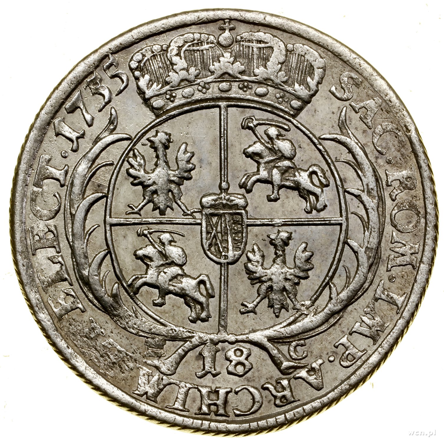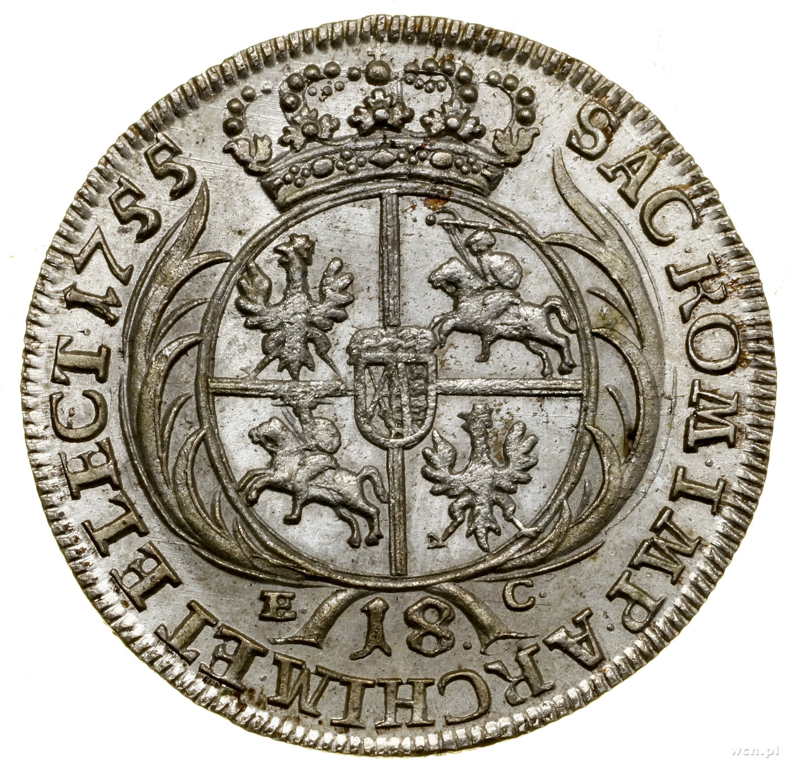 Ort, 1755 EC, Lipsk; typ portretowy z dużą głową władcy, brak krzyżyka globu korony, brosza zapony owalna, gładka, pola korony żeberkowane, w środkowych linijne podwi..