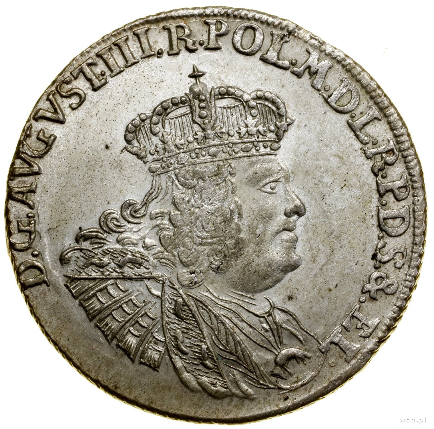 | 265 | August III (1733–1763) / miasto Gdańsk Ort, 1760, Gdańsk; odmiana z mieczem pomiędzy gałązkami palmowymi, liczba 18 ponad wieńcem, inicjały R - E - Œ (mincmistrz Rudolf Ernest Oeckermann); CNG 422, Kahnt 7.. |