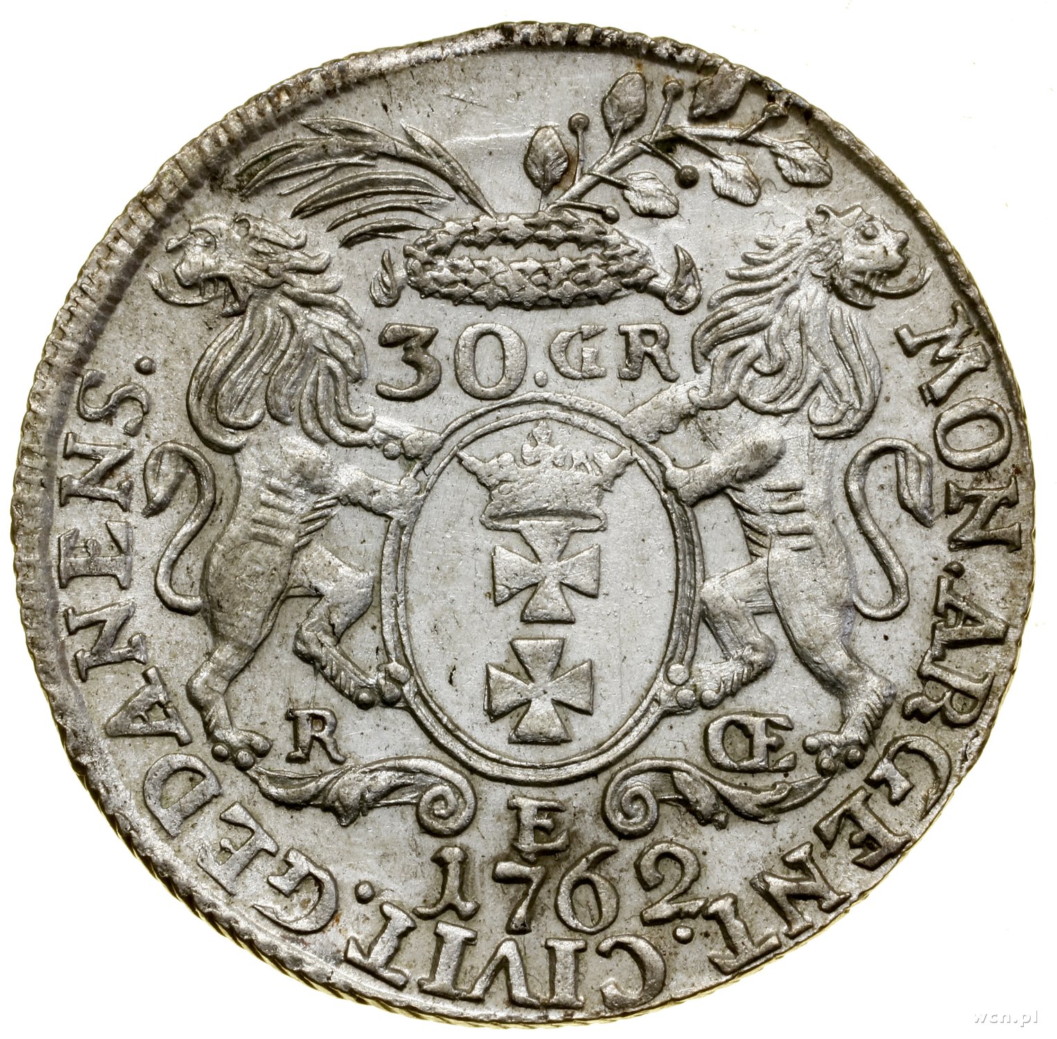| 262 | August III (1733–1763) / miasto Gdańsk Złotówka (30 groszy), 1762, Gdańsk; odmiana z dużym wieńcem nad herbem Gdańska, na rewersie inicjały R - E - Œ (mincmistrza Rudolfa Ernesta Oeckermanna); CNG 424, Kah.. |