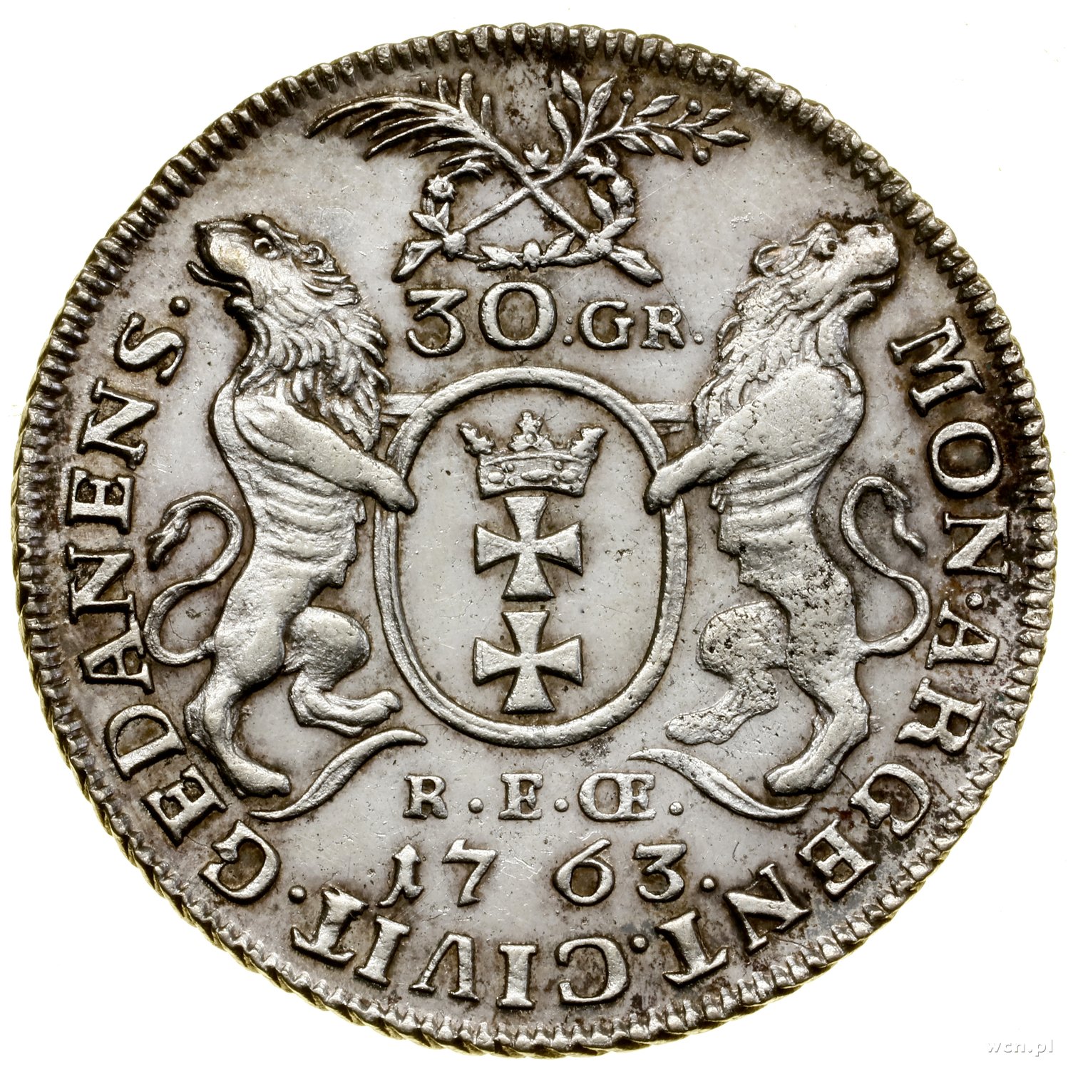 | 263 | August III (1733–1763) / miasto Gdańsk Złotówka (30 groszy), 1763, Gdańsk; na rewersie inicjały R - E - Œ (mincmistrza Rudolfa Ernesta Oeckermanna); CNG 425, Kahnt 720, Kop. 7780 (R3), Slg. Marienburg 8646.. |