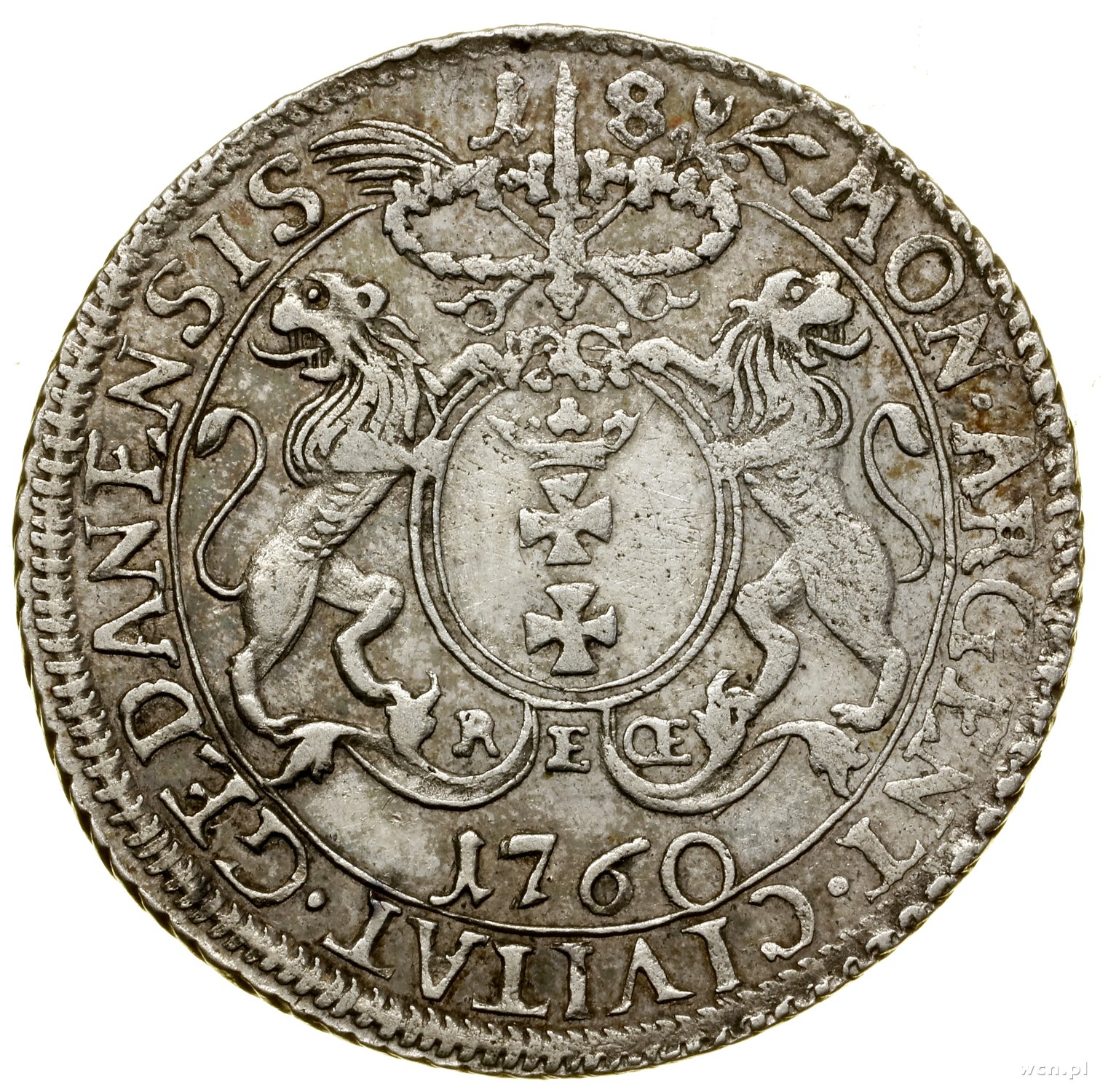 | 270 | August III (1733–1763) / miasto Gdańsk Klipa trojaka z czystego srebra, 1760, Gdańsk; pod tarczą herbową inicjały R - E - Œ (mincmistrz Rudolf Ernest Oeckermann); CNG 408.Ia, H-Cz. 2947 (R3), Iger G.60.1.d.. |