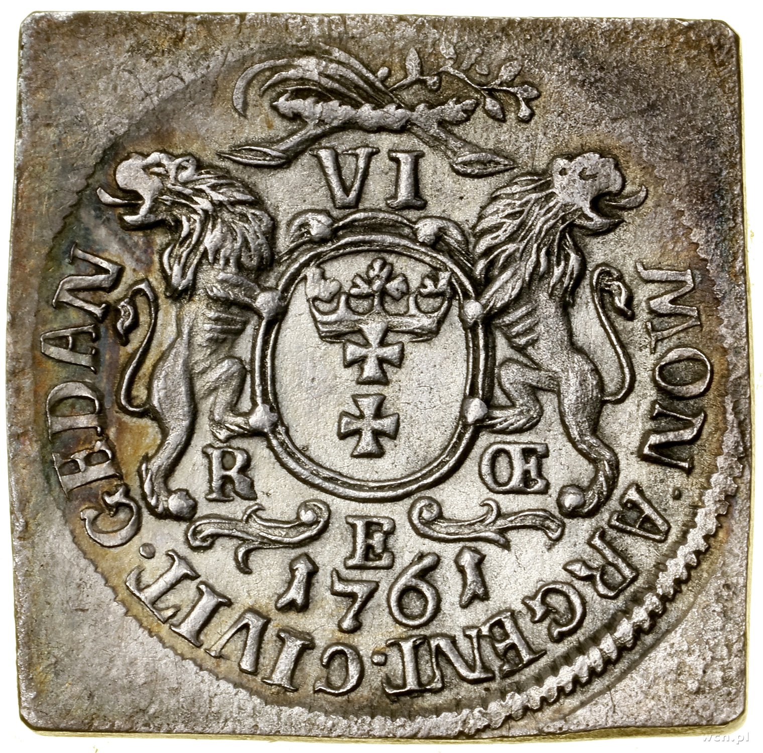 | 267 | August III (1733–1763) / miasto Gdańsk Klipa szóstaka z czystego srebra, 1761, Gdańsk; pod tarczą herbową inicjały R - E - Œ (mincmistrz Rudolf Ernest Oeckermann); CNG 413.Ib, H.-Cz. 2957 (R2), Kahnt 731, .. |