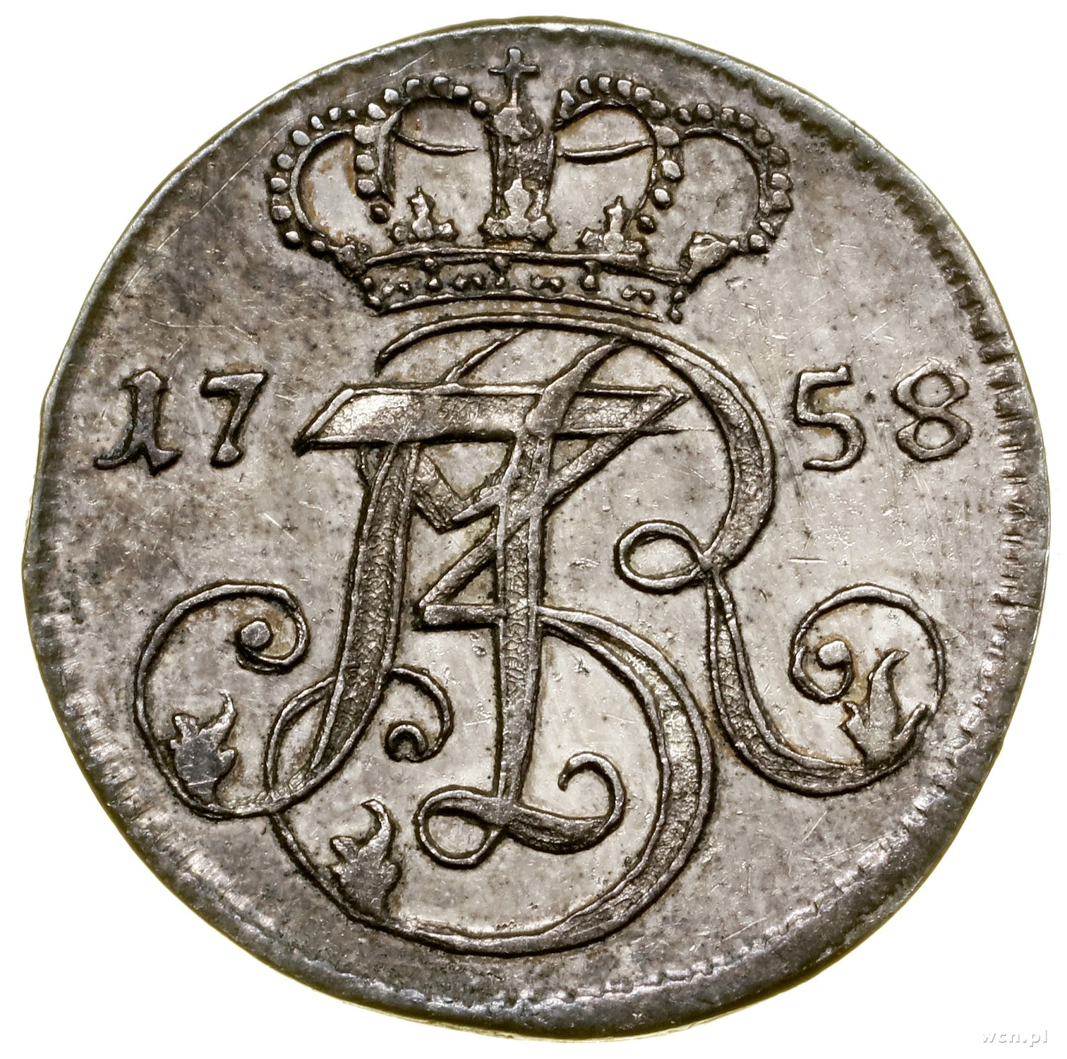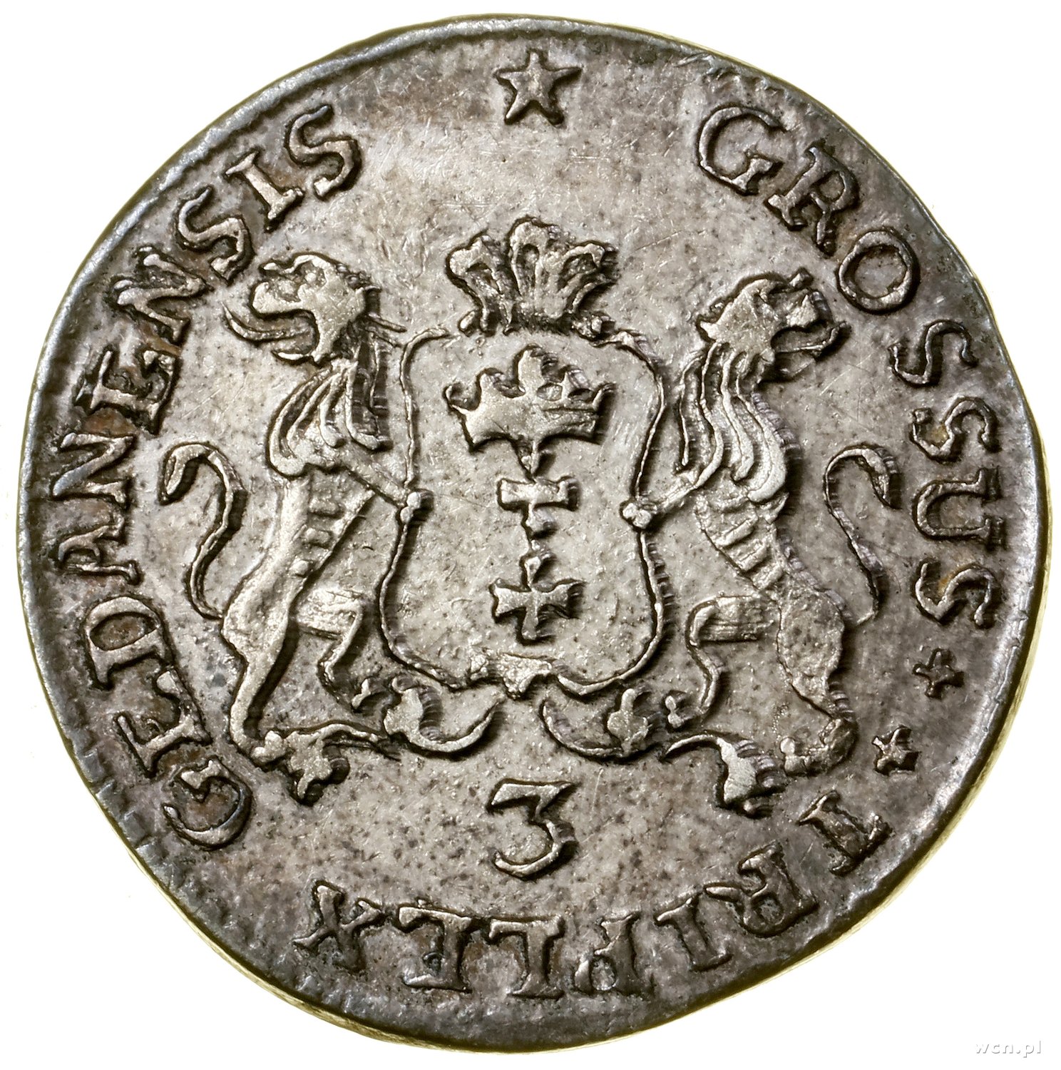 | 269 | August III (1733–1763) / miasto Gdańsk Trojak, 1758, Gdańsk; na rewersie cyfra 3 pod herbem Gdańska; CNG 407, Iger G.58.1.a (R), Kahnt 735, Kop. 7734 (R2), Kurp. (1697–1763) 939 (R2), Merseburger 1803; pat.. |
