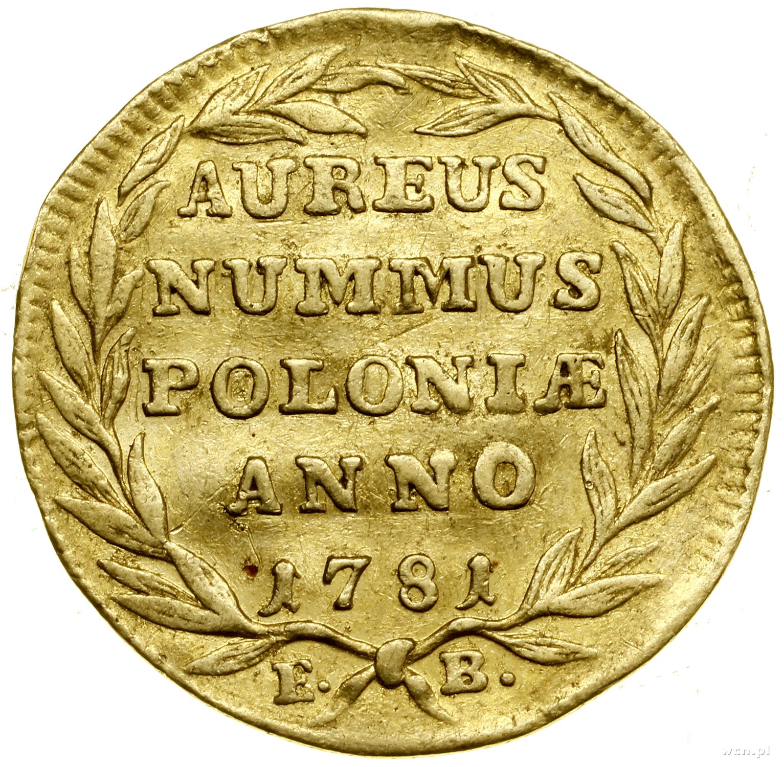 | 279 | Stanisław August Poniatowski (1764–1795) / monety koronne Dukat, 1781 EB, Warszawa; Aw: Głowa króla w prawo, wokoło legenda STANISLAUS AUG D G REX POL M D L; Rw: Otoczony wieńcem pięciowierszowy napis AUREUS / NUMMUS / POLON.. |