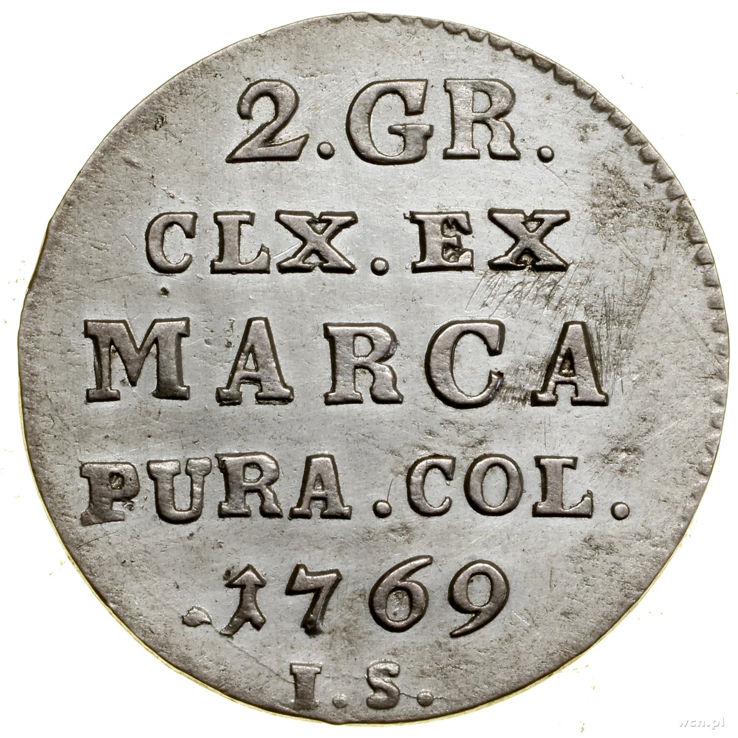 | 291 | Stanisław August Poniatowski (1764–1795) / monety koronne Półzłotek (2 grosze srebrne), 1769 IS, Warszawa; wariant z wieńcem wokół tarczy z mniejszą liczbą liści; Kop. 2324, Parchimowicz SAP 16.d1, Plage 250; przetarty, ale .. |