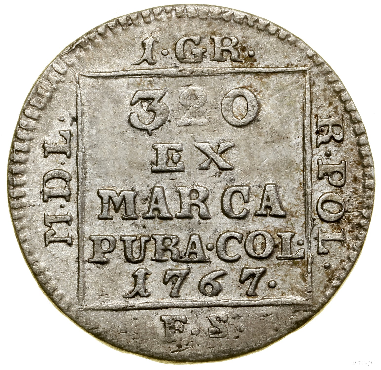 | 294 | Stanisław August Poniatowski (1764–1795) / monety koronne Grosz srebrny, 1767 FS, Warszawa; wąska korona (odmiana bez krzyża) nad monogramem; Kop. 2302, Parchimowicz SAP 15.b1, Plage –; bardzo ładnie zachowany. |
