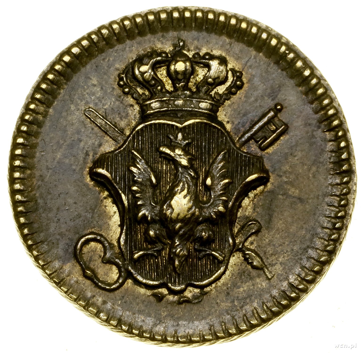 | 297 | Stanisław August Poniatowski (1764–1795) / odważniki monetarne Odważnik dukata, 1767, Warszawa; Aw: Tarcza herbowa, w tle miecz i klucz; Rw: Poziomy napis i DUCAT 1767; Plage 477; mosiądz, 3.49 g; subtelna patyna, duży blask menn.. |