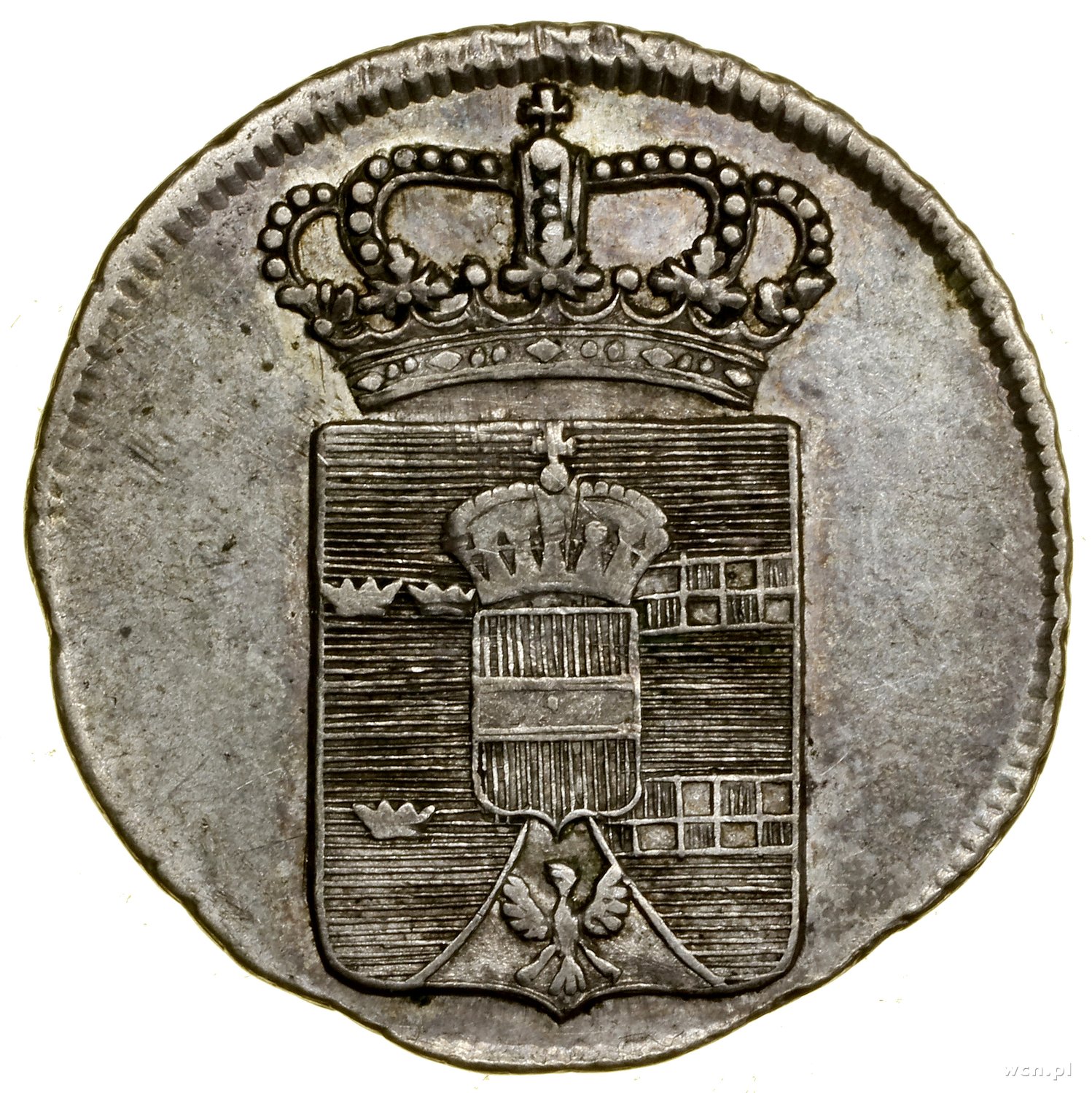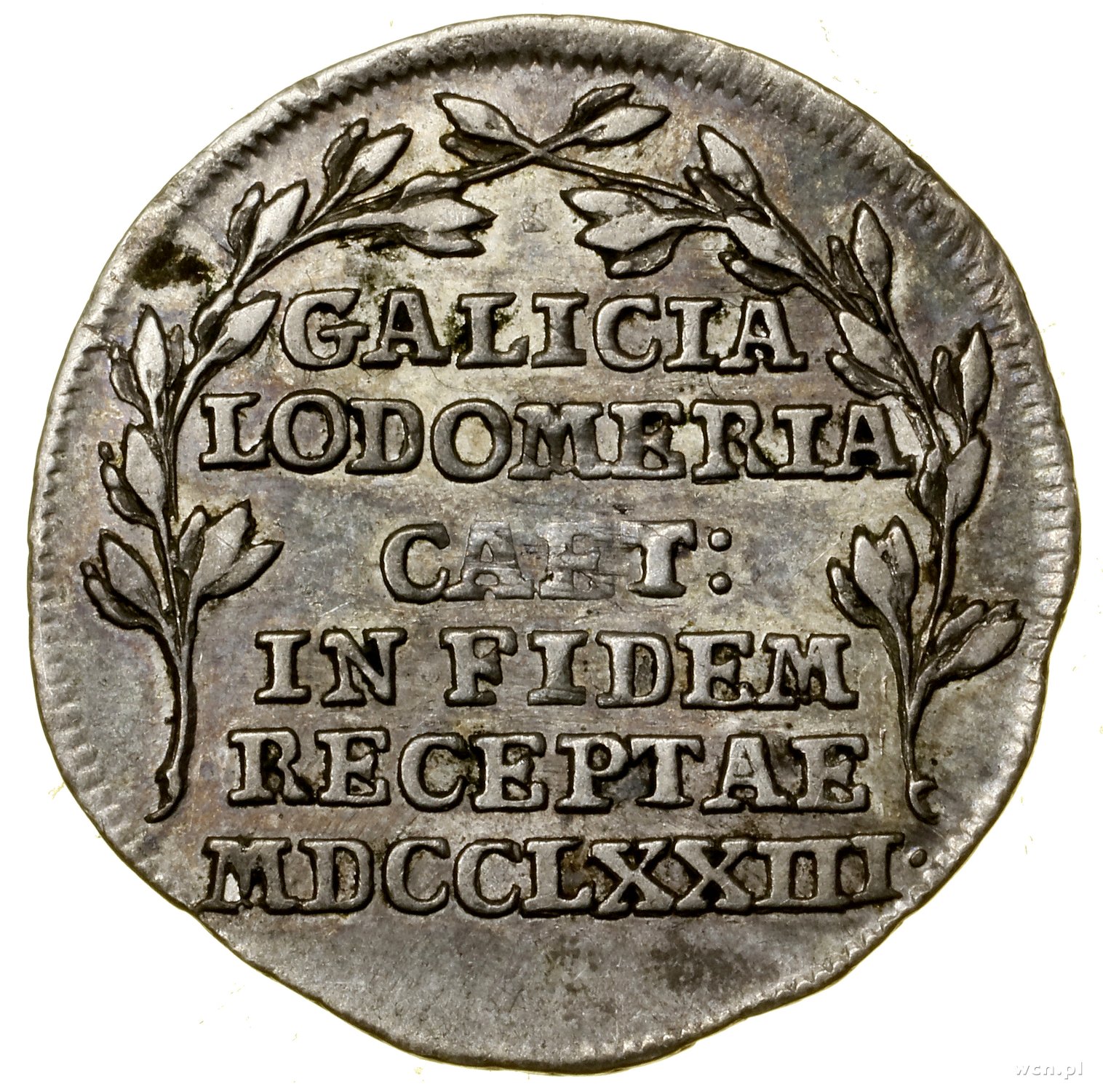 Żeton, 1773; wybity z okazji przyłączenia Galicji i Lodomerii do Cesarstwa Austriackiego; Aw: Ukoronowana tarcza herbowa Galicji, Lodomerii i Oświęcimia; Rw: w wieńcu..