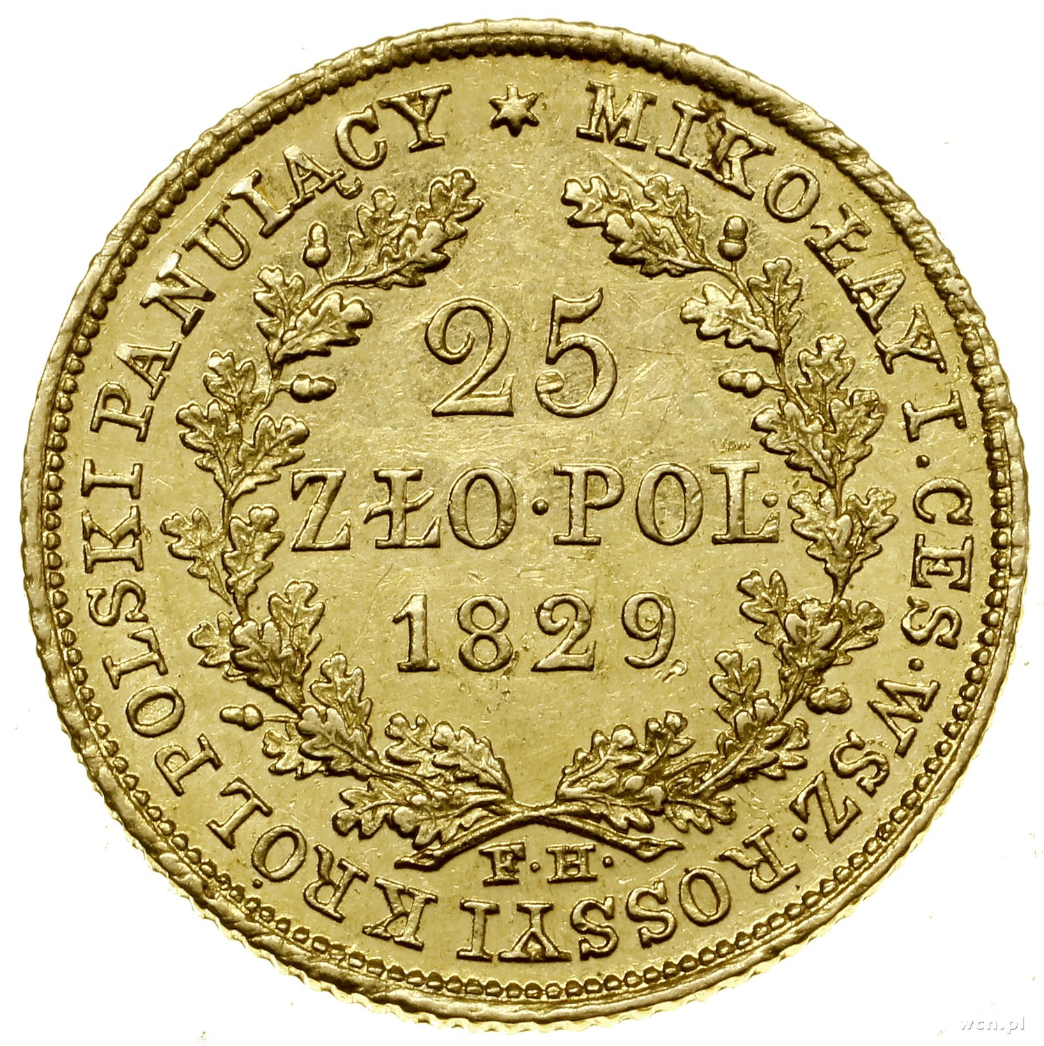 | 309 | Królestwo Kongresowe (1815–1835) / Mikołaj I (1825–1855) 25 złotych, 1829 FH, Warszawa; Aw: Głowa cara w prawo i napis w otoku ALEXANDER I CES ROS WSKRZESICIEL KRÓL POLS 1815; Rw: Nominał i data otoczone wieńcem z liści dęb.. |