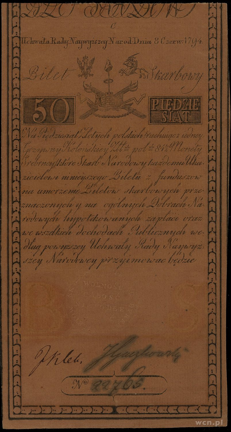 50 złotych polskich, 8.06.1794; seria C, numeracja 22765, z widocznym znakiem wodnym firmy D&C Blauw, podpisy Jana Klemensa Gaczkowskiego i Jana Kleka; Lucow 31 (R3),..