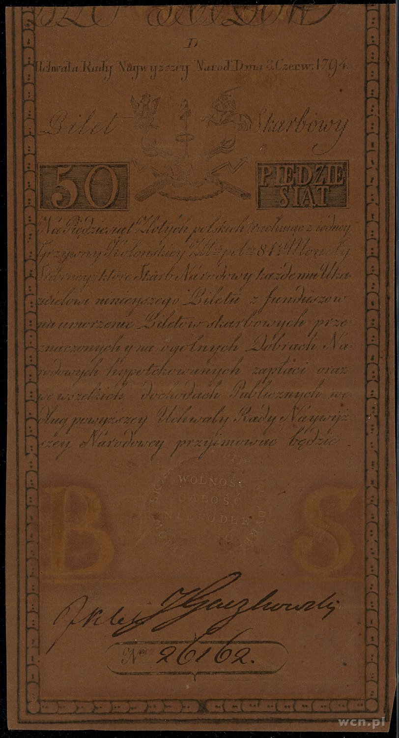 50 złotych polskich, 8.06.1794; seria D, numeracja 26162, papier bez znaku wodnego, podpisy Jana Klemensa Gaczkowskiego i Jana Kleka; Lucow 32 (R2), Miłczak A4; ugięc..