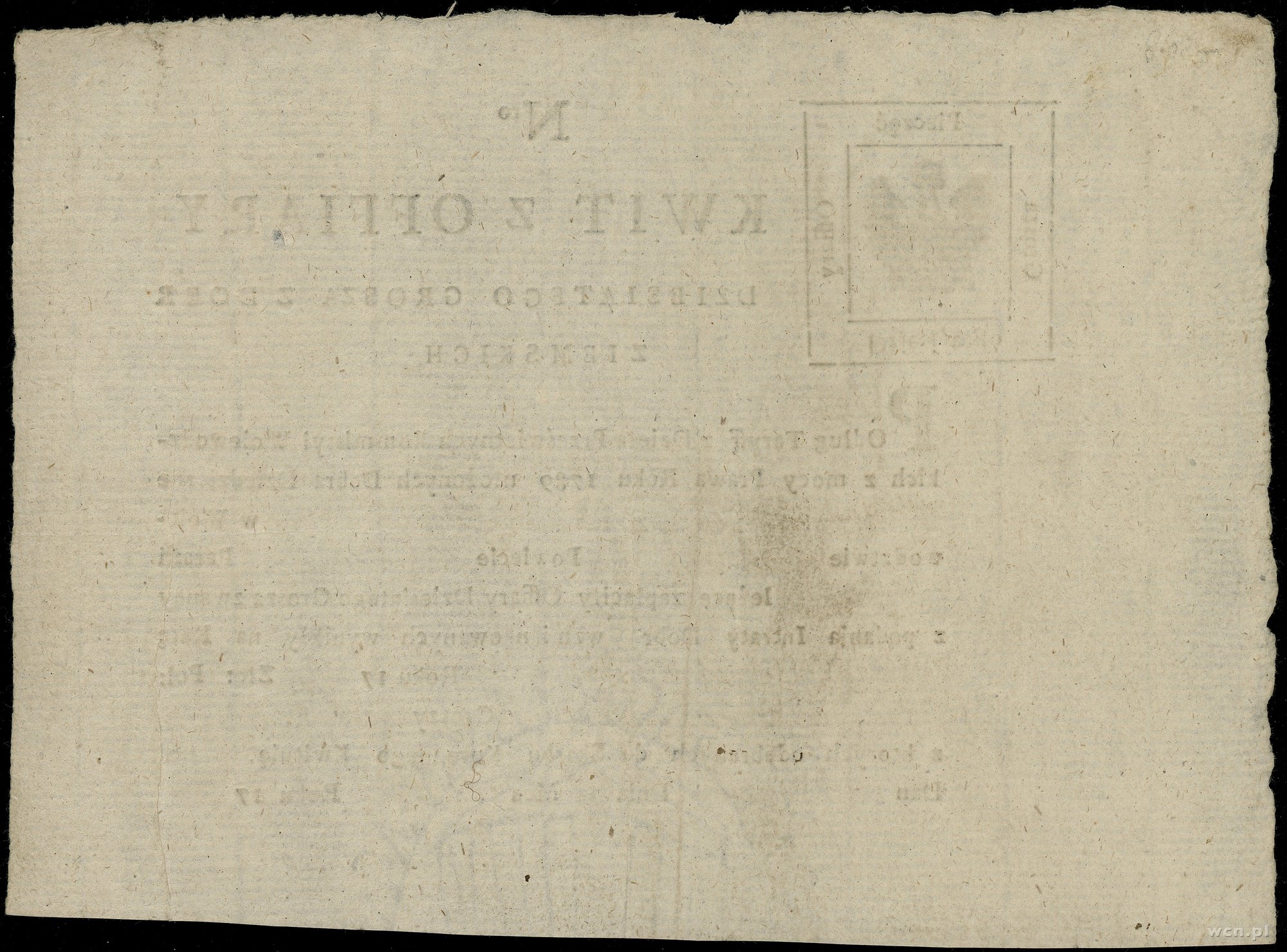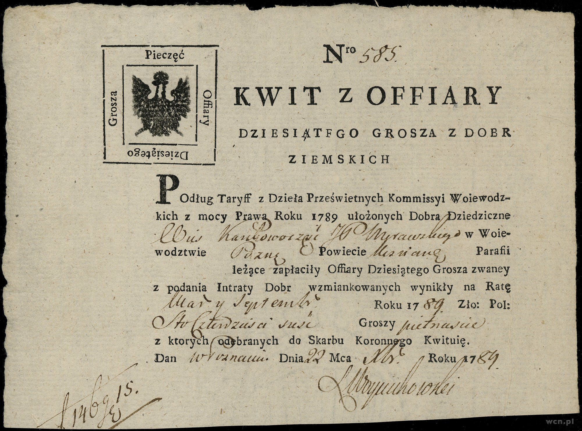 Kwit z ofiary dziesiątego grosza z dóbr ziemskich, 22.12.1789; numeracja 585, kwit potwierdzający zapłatę wystawiony dla wsi Kantowocz w Poznańskim należącej do p. Mu..