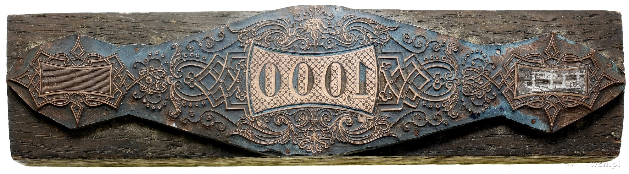 Klocek do druku fragmentu Pożyczki Ogólnej Narodowej Polskiej 5% na kwotę 1.000 złotych polskich z roku 1863; z widocznym nominałem 1.000 złotych, seria C; format 168..