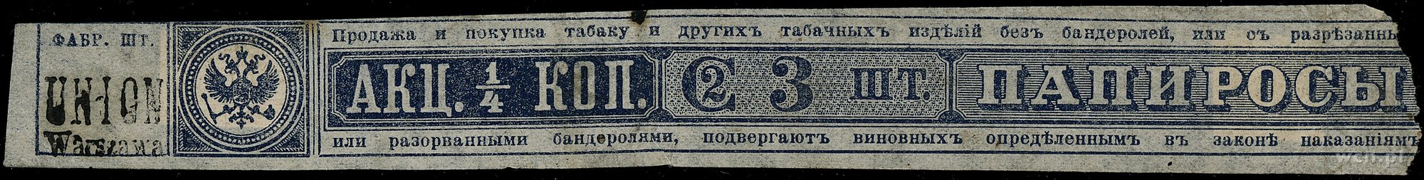 Kwity akcyzy tytoniowej z XIX / XX wieku wartości 1/4 kopiejki (Union Warszawa) i 100 groszy (stempel z 1924 roku); ślady po podlepkach, razem 2 sztuki, duża rzadkość.
