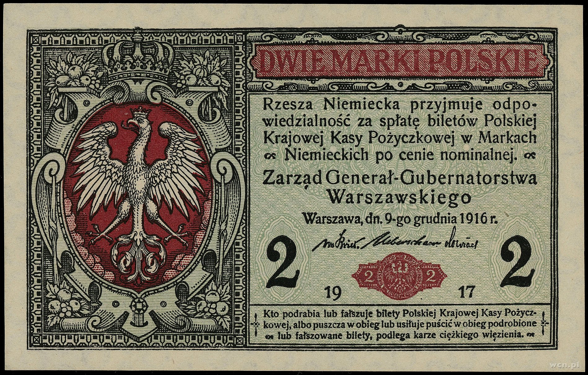 2 marki polskie, 9.12.1916; Generał, seria B, numeracja 4709863; Lucow 277 (R2), Miłczak 9b, Ros. 451b; lewy dolny rożek minimalnie nieświeży, banknot pięknej prezenc..