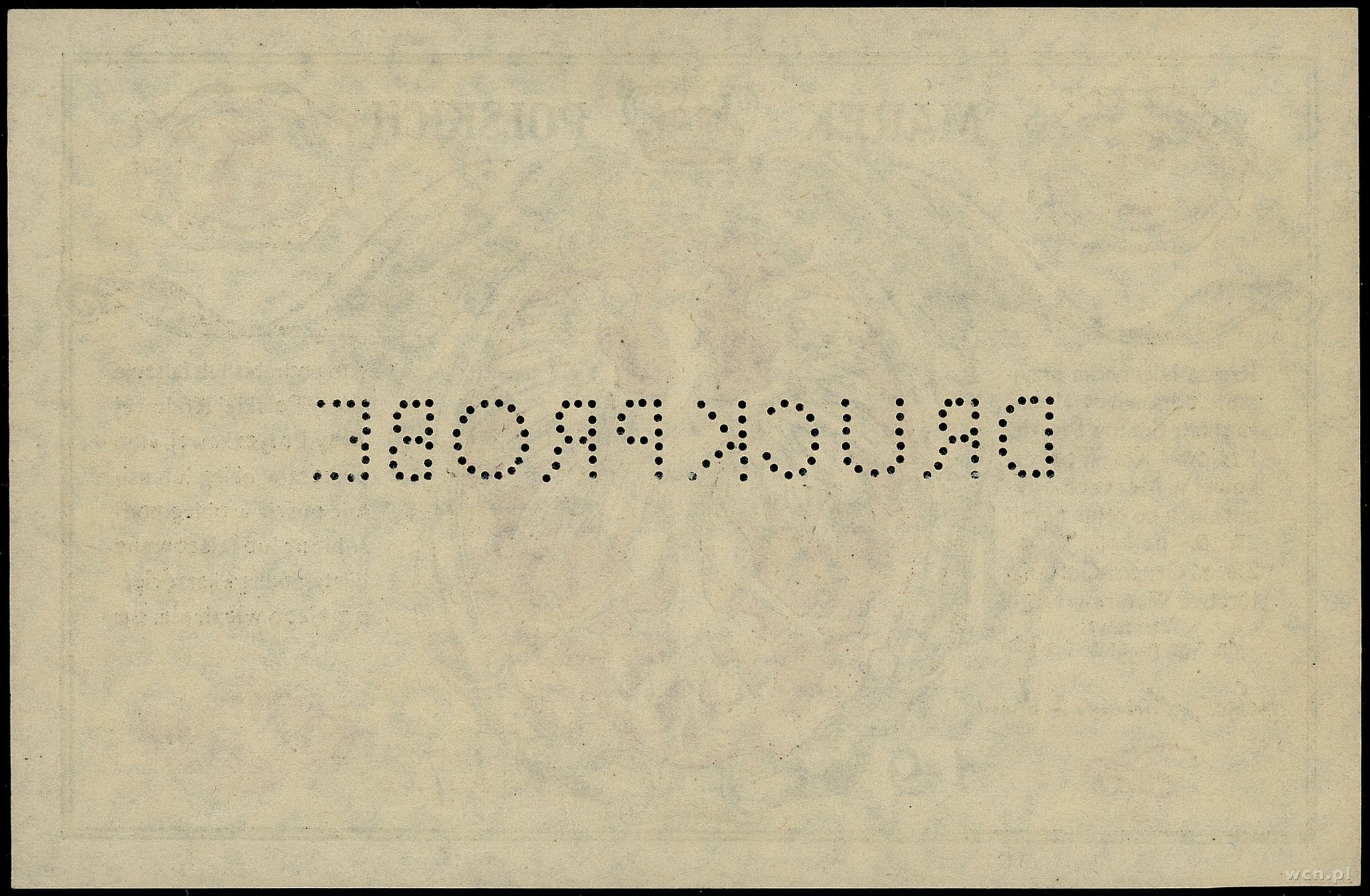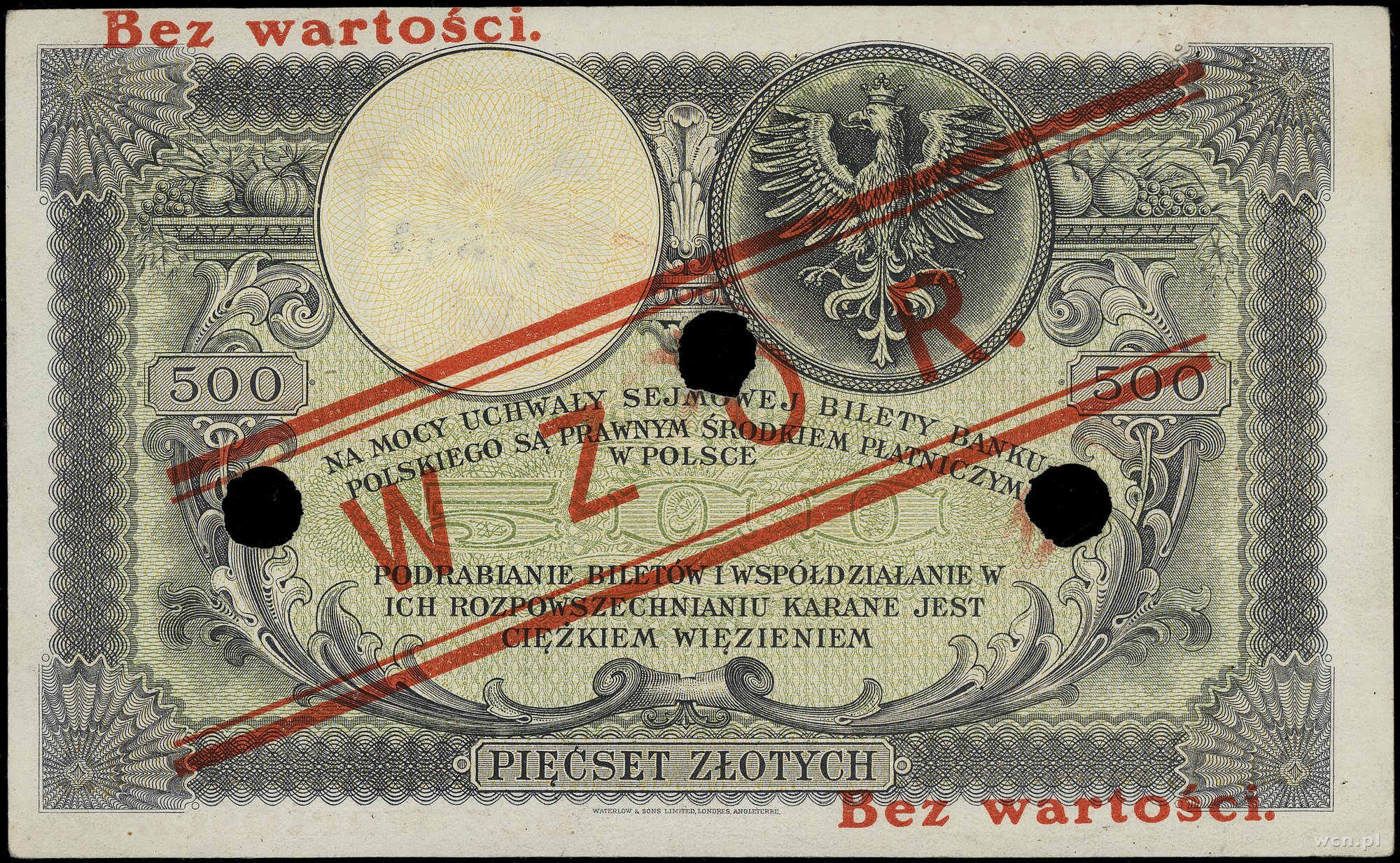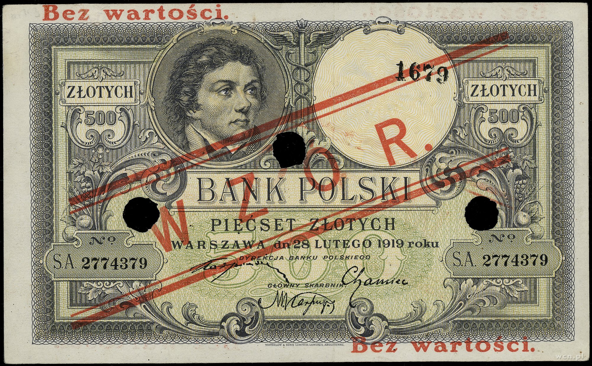 500 złotych, 28.02.1919; seria A, numeracja 2774379, czerwony ukośny nadruk WZÓR i dwukrotnie poziomo BEZ WARTOŚCI, z trzykrotną perforacją, dodatkowa numeracja wzoru..