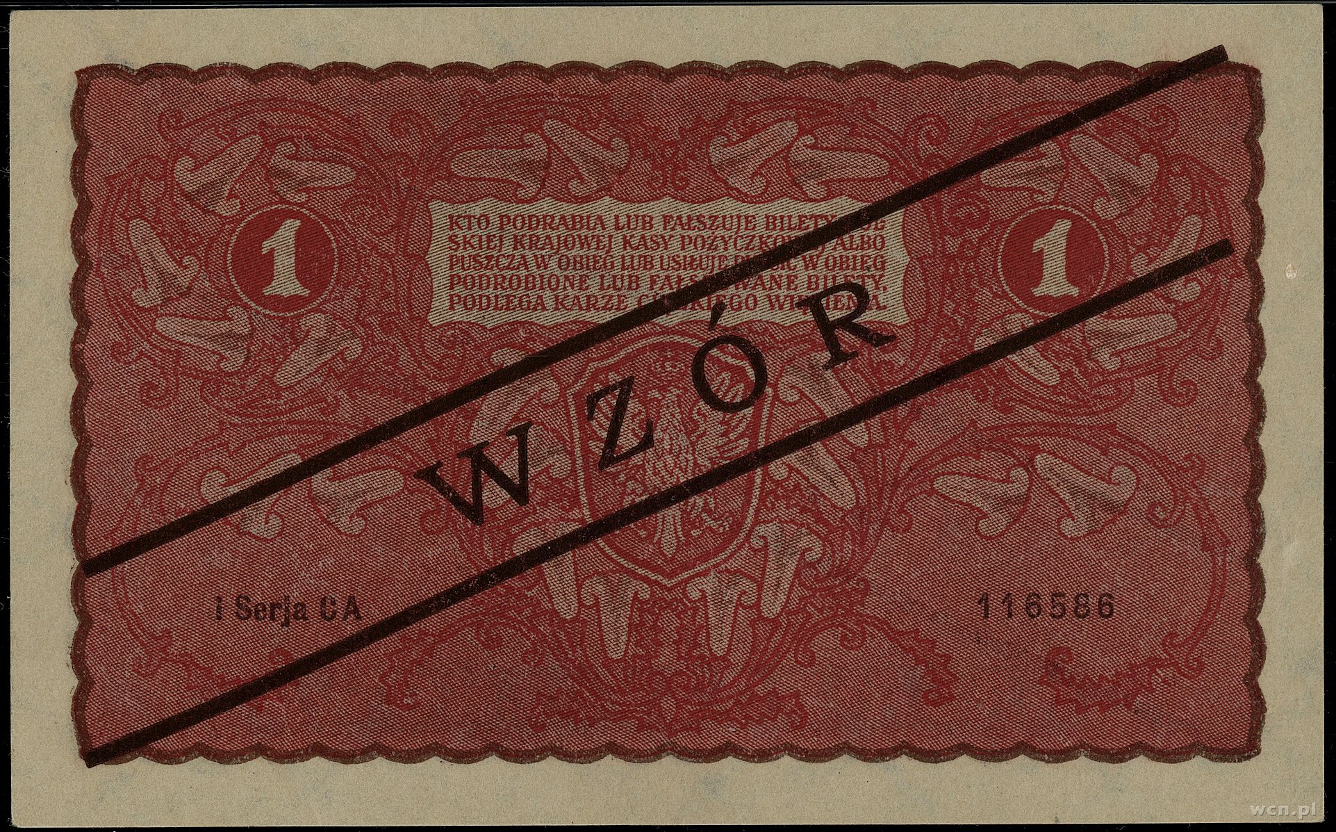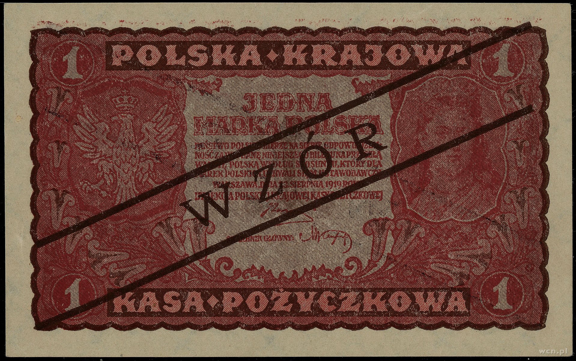 1 marka polska, 23.08.1919; seria I-CA, numeracja 116586, czarny ukośny nadruk WZÓR po obu stronach banknotu; Lucow 356 (R4), Miłczak 23Wa; piękny egzemplarz w opakow..