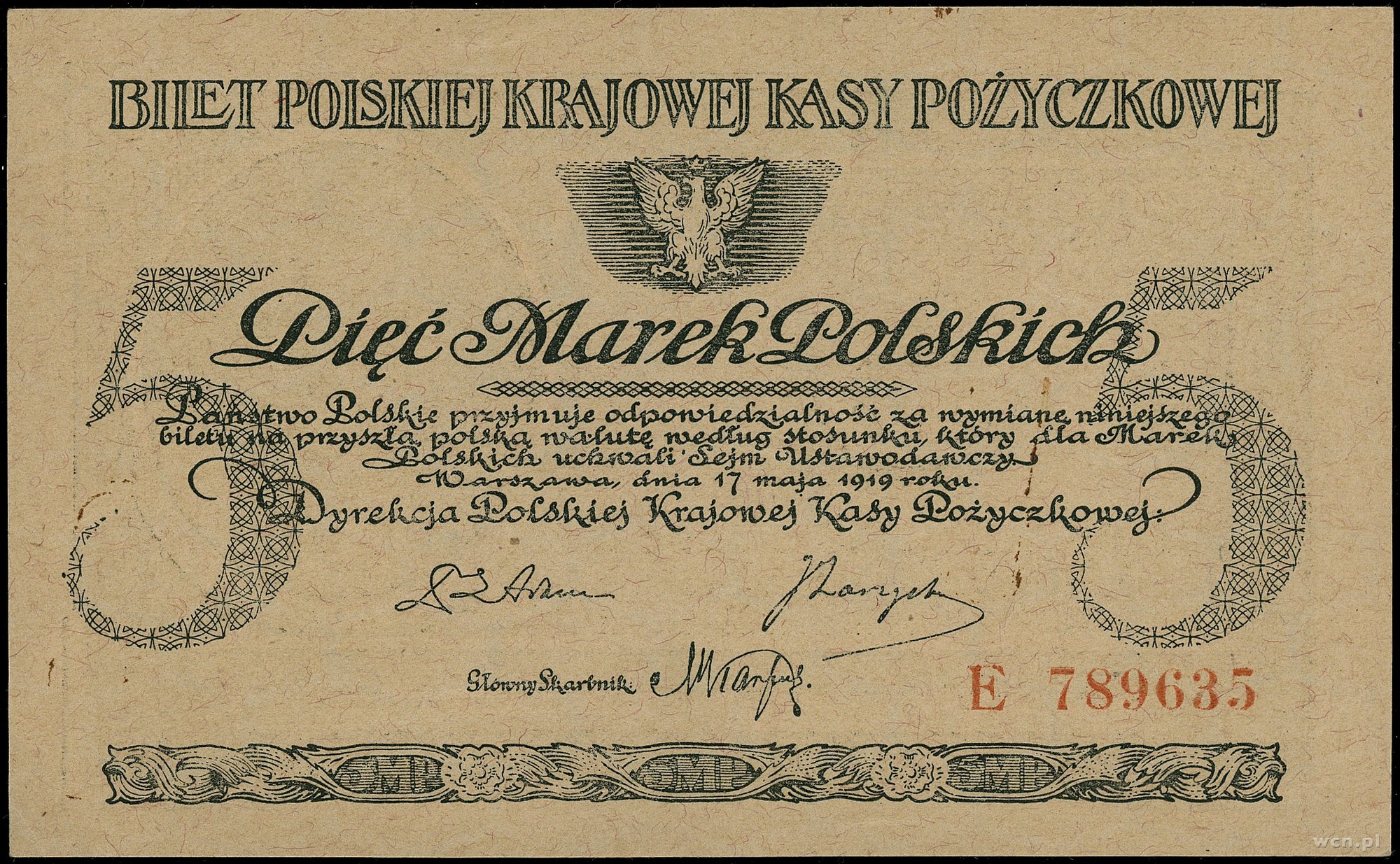 5 marek polskich, 17.05.1919; seria E, numeracja 789635; Lucow 328 (R2), Miłczak 20b; ugięcia i złamanie na dolnym marginesie, u góry zagniotka, miejscowo rdzawe ślady.