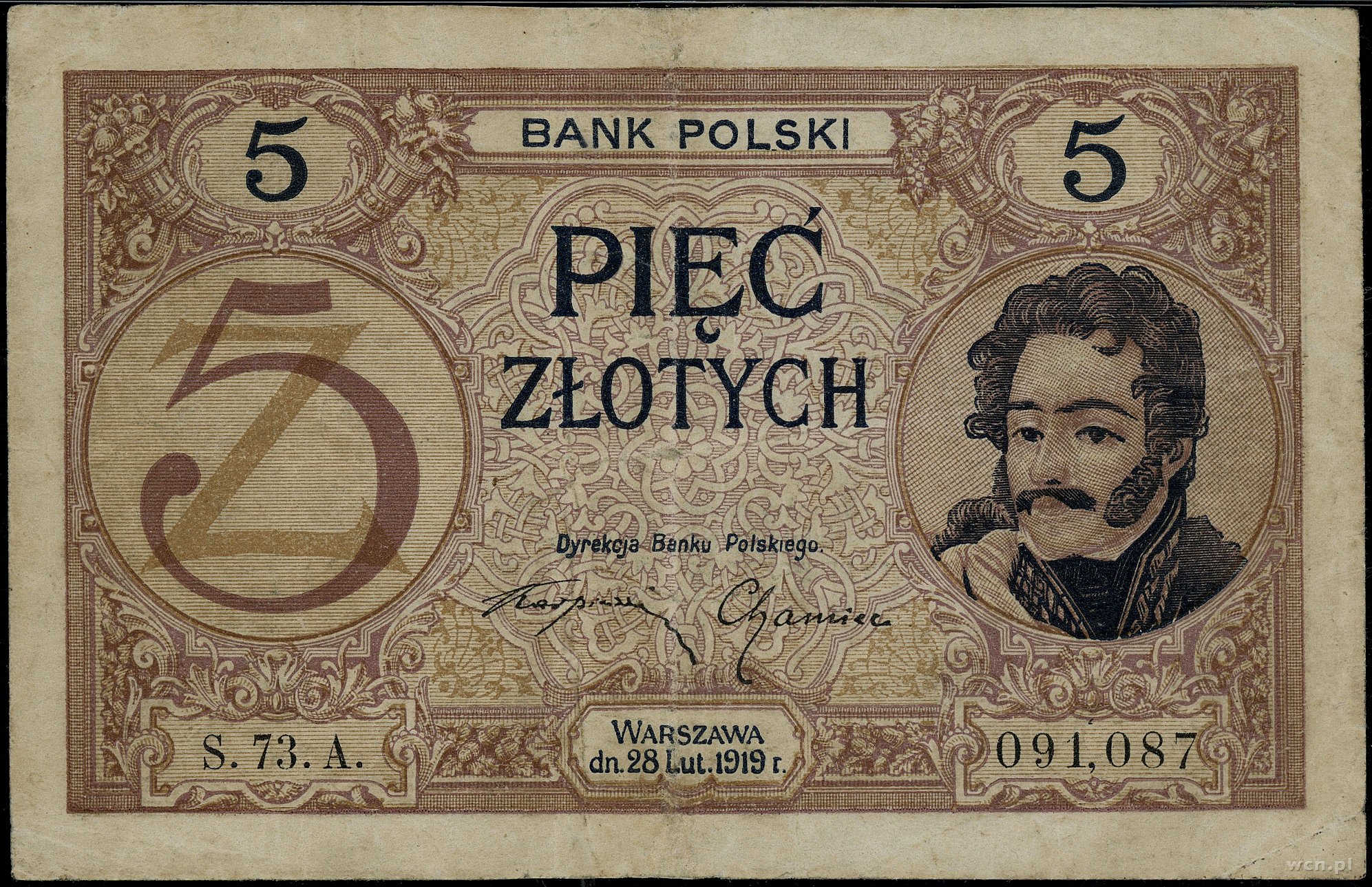 5 złotych, 28.02.1919; seria 73.A, numeracja 091087; Lucow 571 (R5), Miłczak 49b; przedarcia naprawione konserwatorsko, rzadki typ banknotu w opakowaniu PMG 1922528-0..