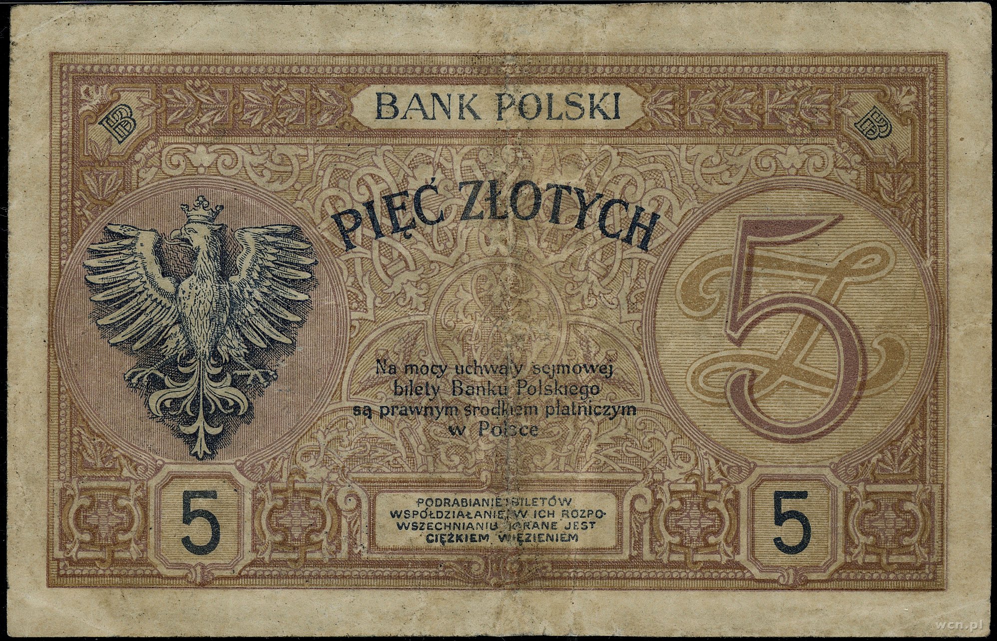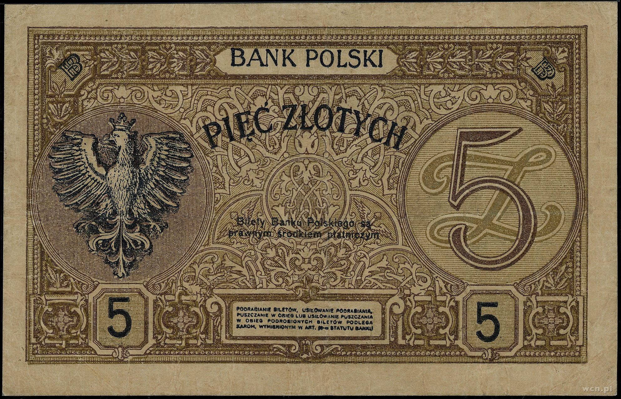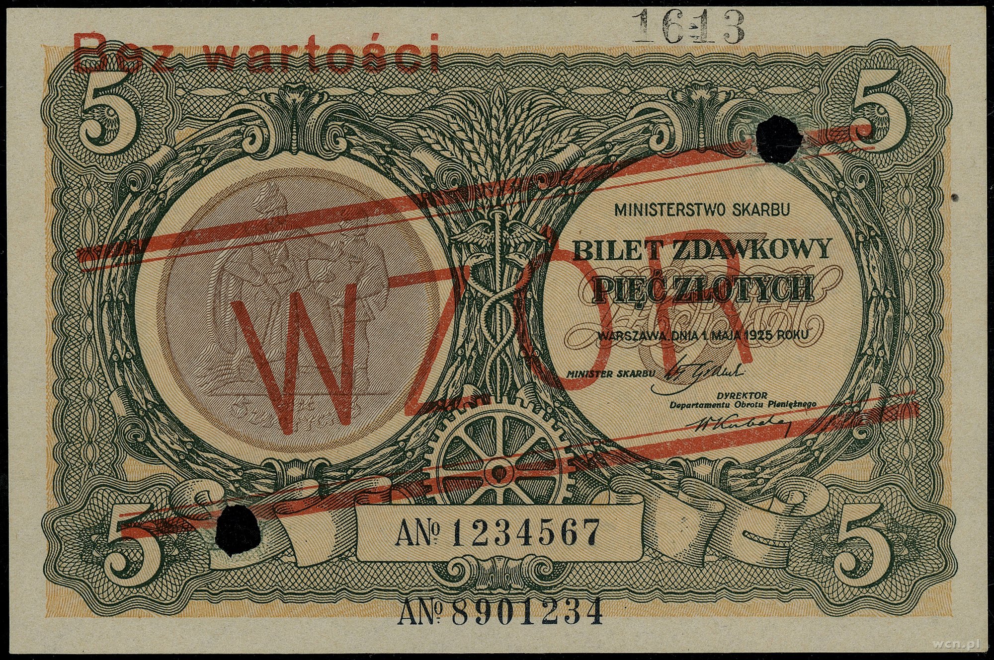 5 złotych, 1.05.1925; seria A, numeracja 1234567 / 8901234, czerwony nadruk WZÓR i poziomo BEZ WARTOŚCI po obu stronach banknotu, dwukrotnie perforowane, dodatkowa nu..