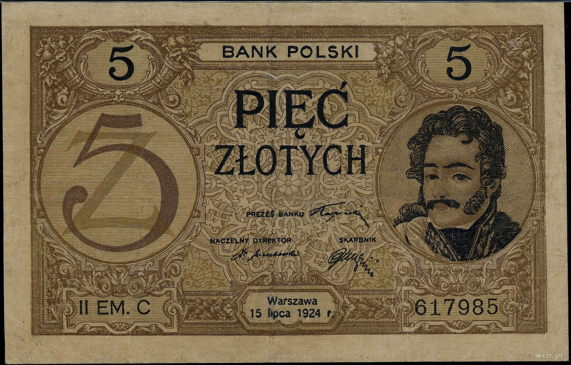 5 złotych, 15.07.1924; II emisja, seria C, numeracja 617985; Lucow 604 (R5) - (nie notuje tej serii), Miłczak 57; banknot po konserwacji, ślady po złamaniach, rzadki ..