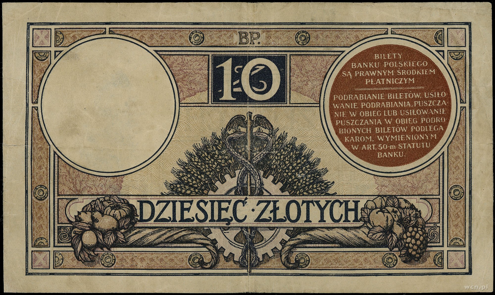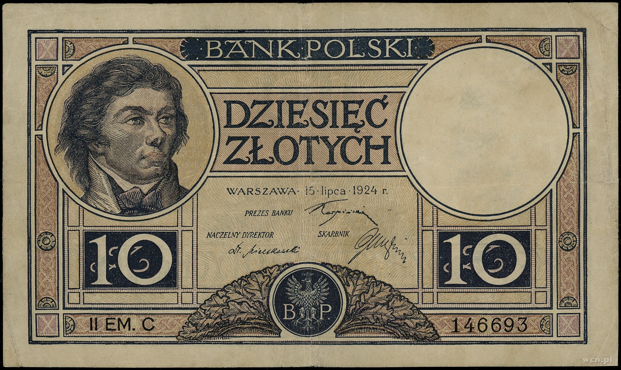 10 złotych, 15.07.1924; II emisja, seria C, numeracja 146693; Lucow 606 (R6) - (nie notuje tej serii), Miłczak 58a; kilka złamań, egzemplarz po konserwacji, bardzo rz..