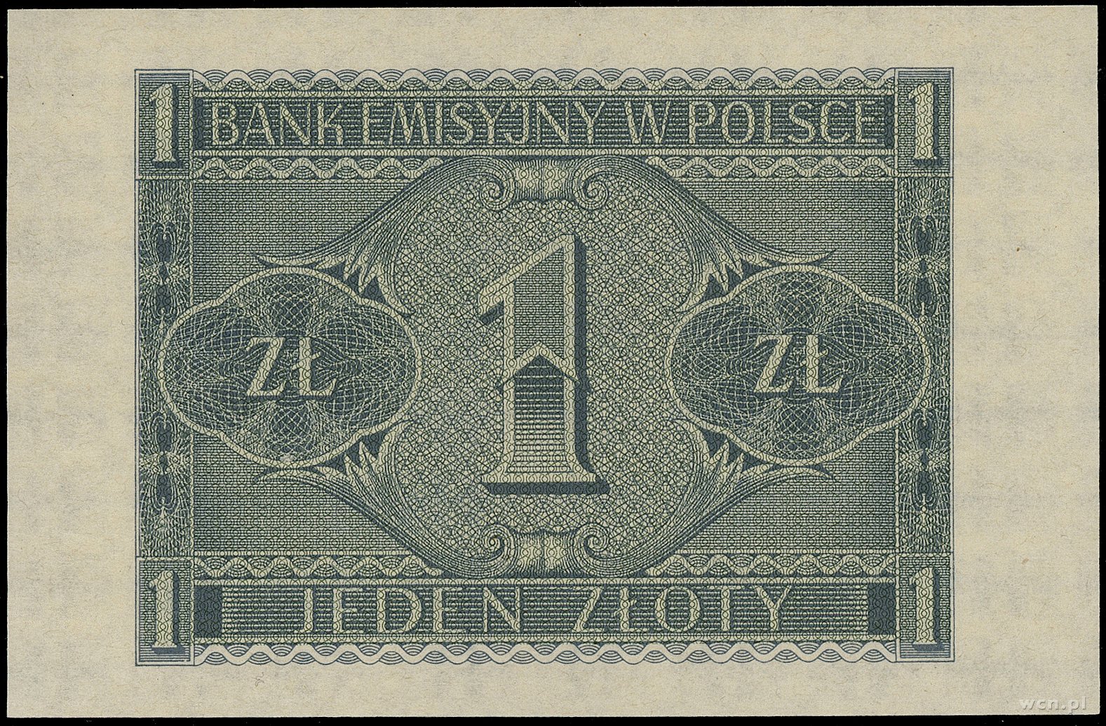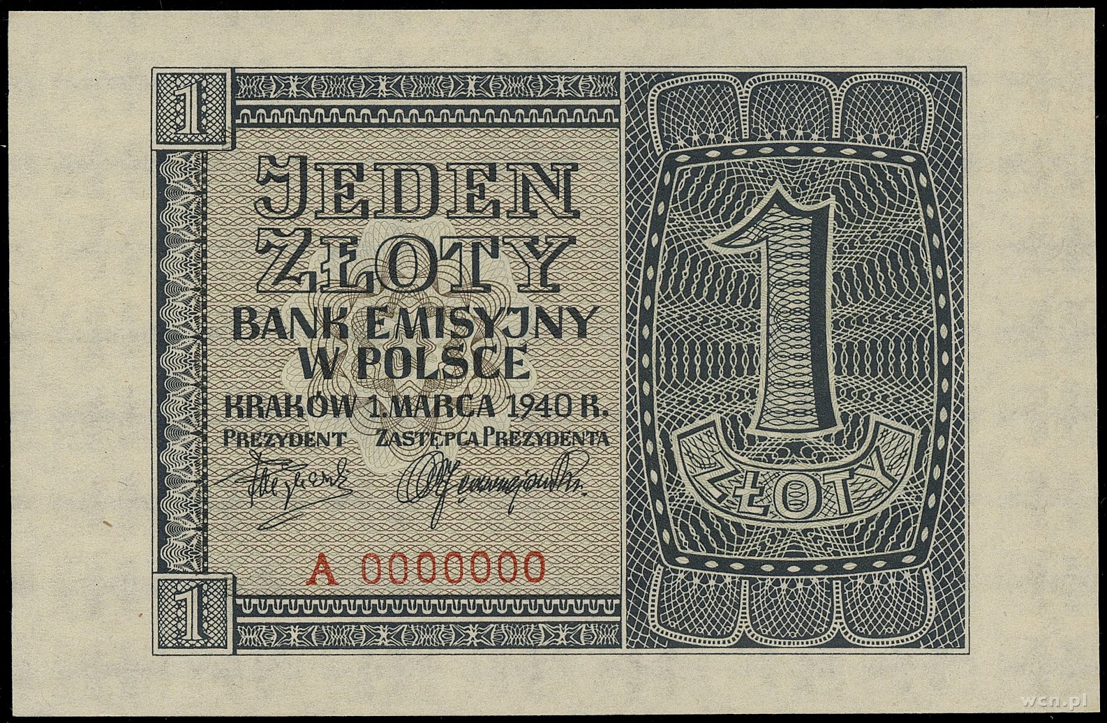 1 złoty, 1.03.1940; seria A, numeracja 0000000, bez perforacji i bez nadruków WZÓR; Lucow 764 (R6) - ale nie notuje tej serii, Miłczak 91Wa; ugięty lewy dolny rożek, ..
