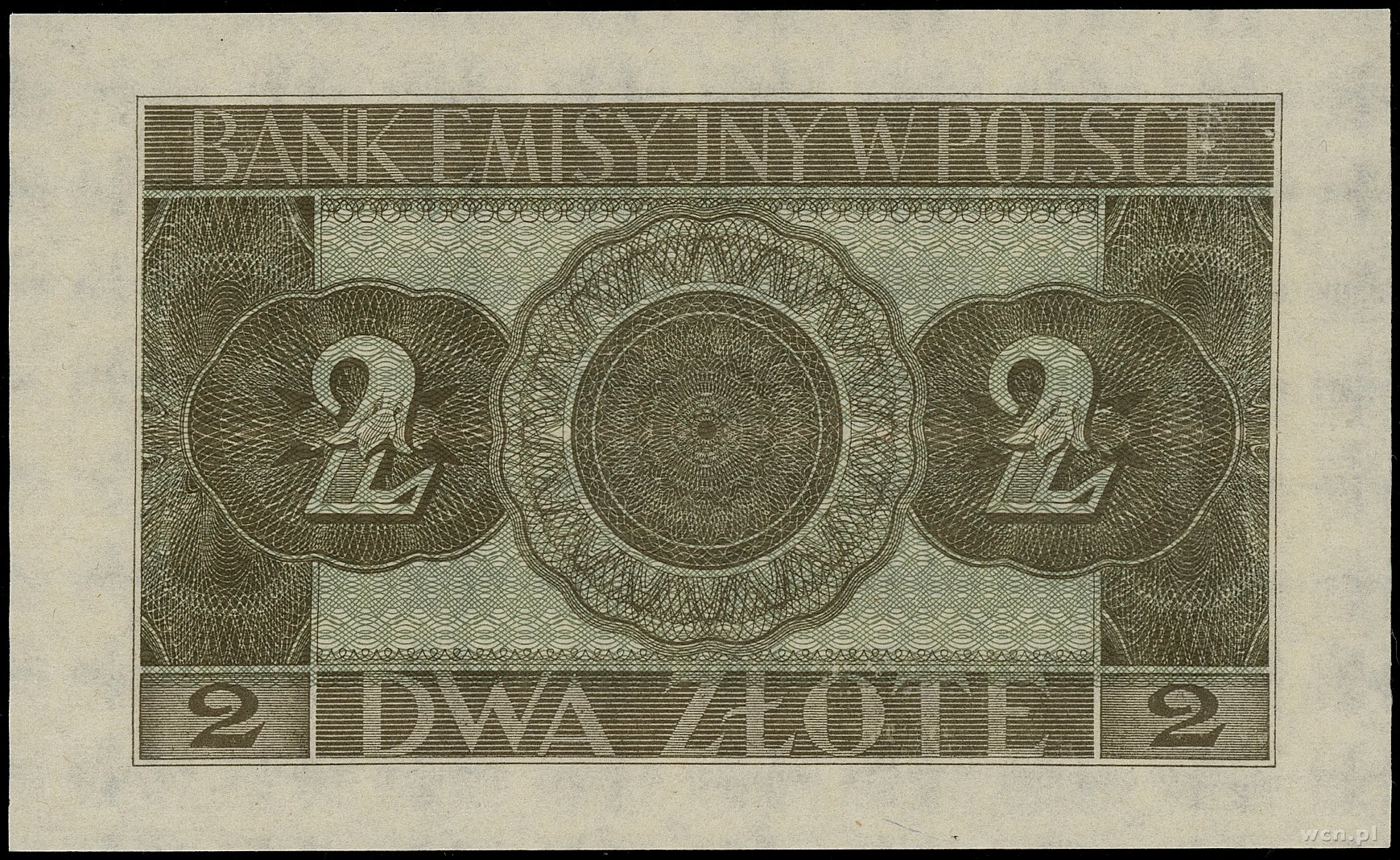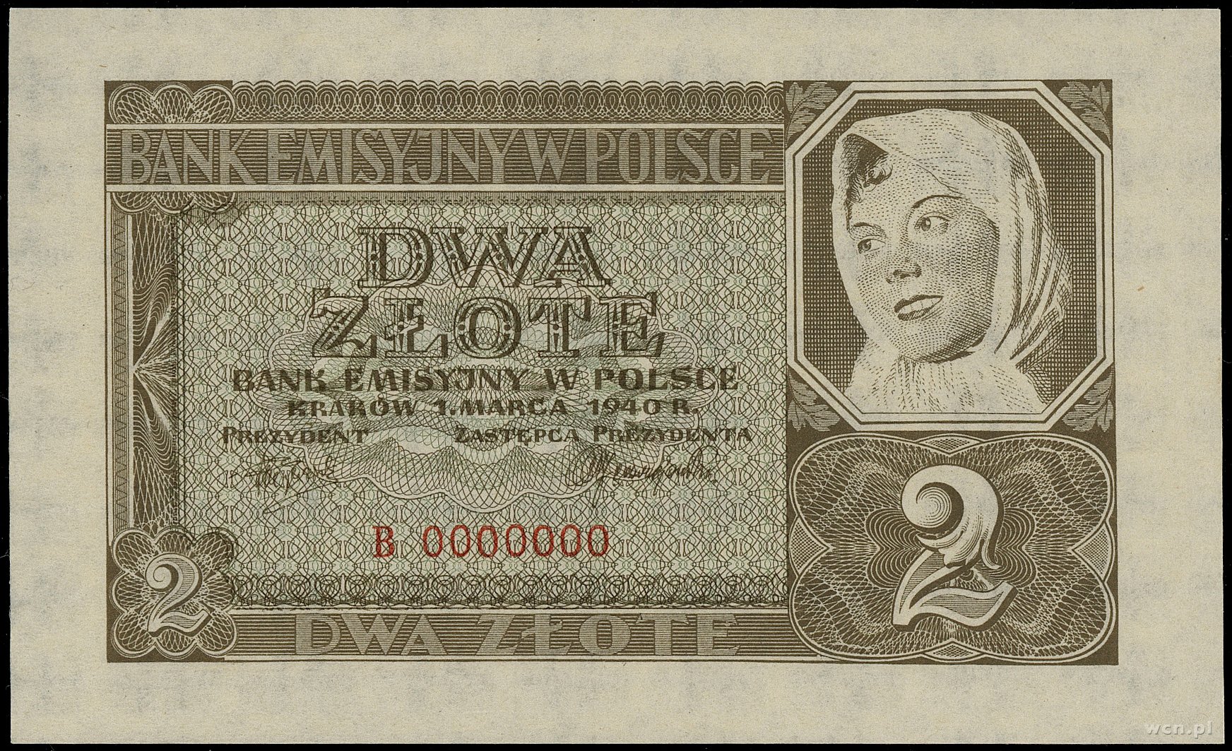2 złote, 1.03.1940; seria B, numeracja 0000000, bez perforacji i bez nadruków WZÓR; Lucow 769 (R6), Miłczak 92Wa; odświeżany papier, rzadki typ banknotu.