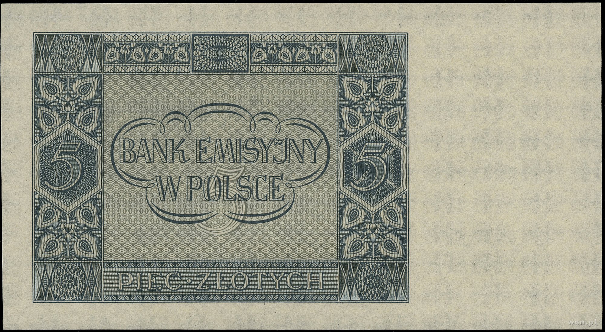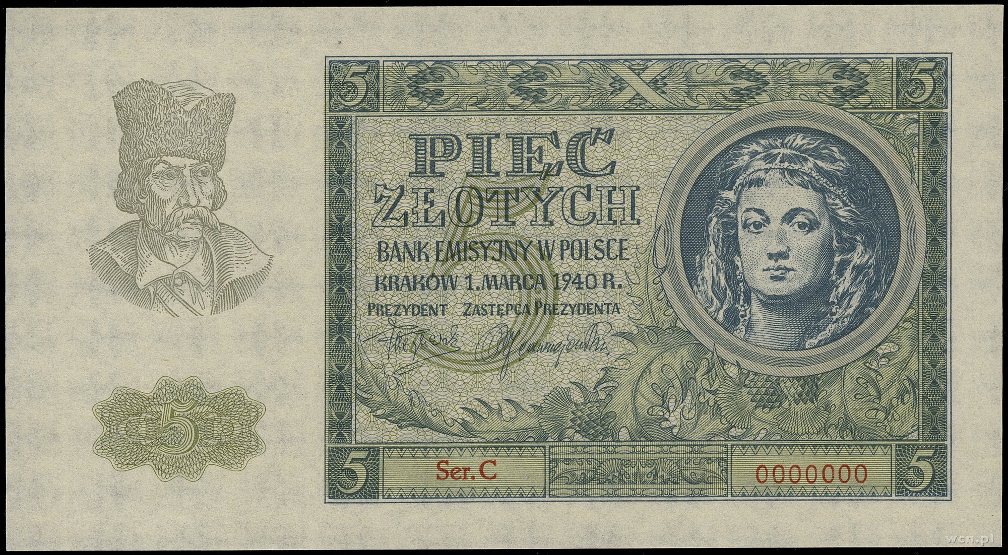 5 złotych, 1.03.1940; seria C, numeracja 0000000, bez perforacji i bez nadruków WZÓR; Lucow 772 (R6), Miłczak 93Wb; papier odświeżony, rzadki typ banknotu.