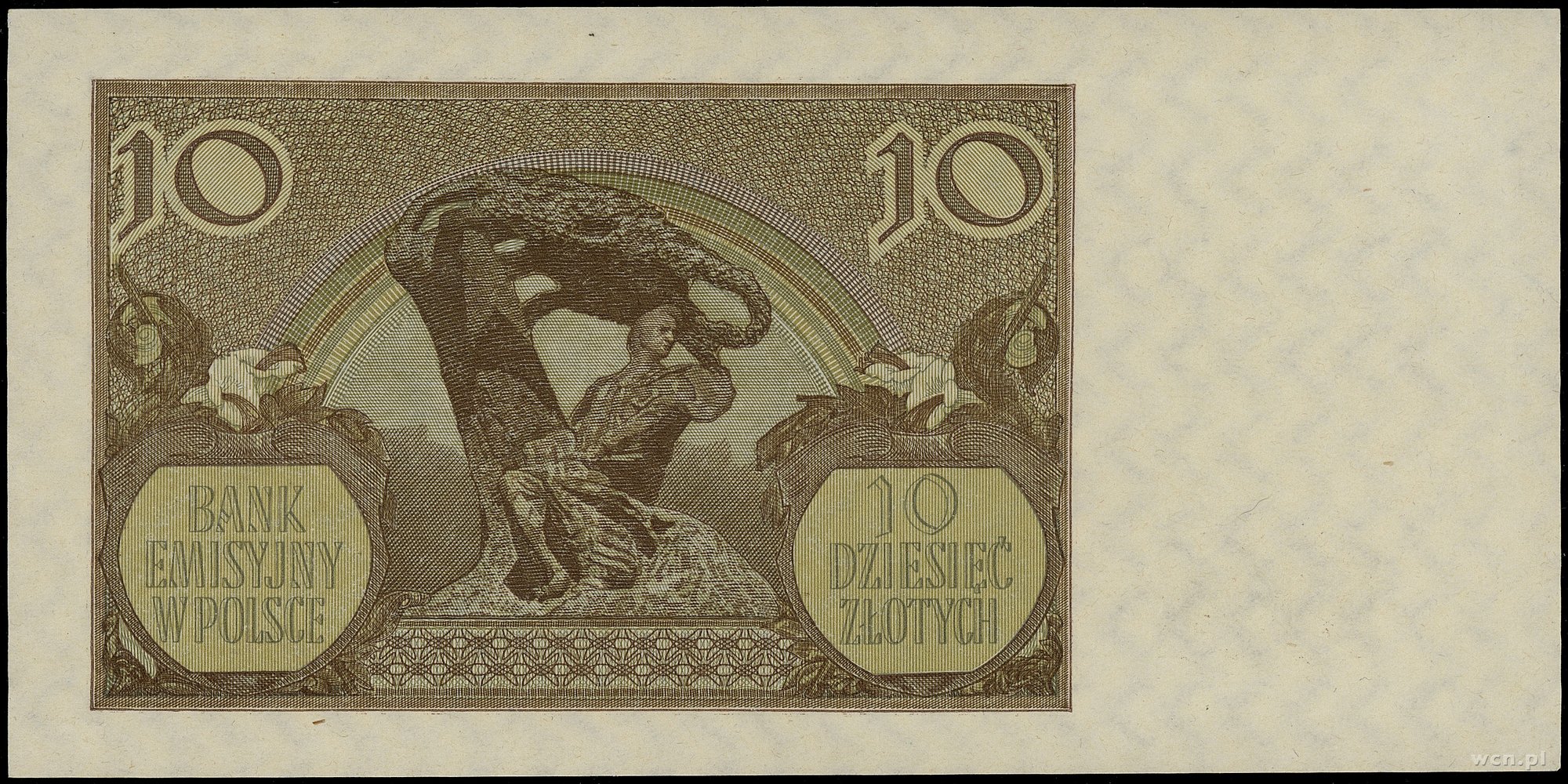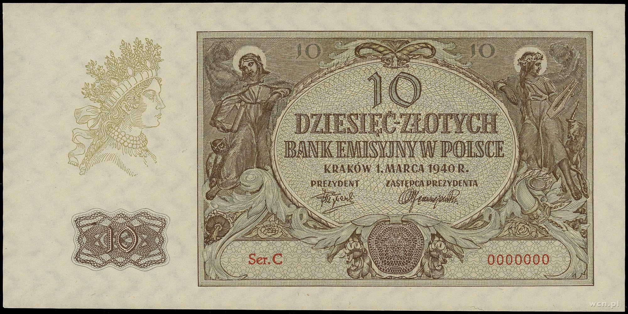 10 złotych, 1.03.1940; seria C, numeracja 0000000, bez perforacji i bez nadruków WZÓR; Lucow 776 (R6), Miłczak 94Wb; papier odświeżony, rzadki typ banknotu.