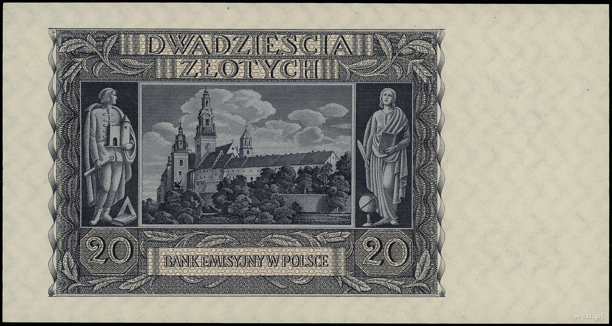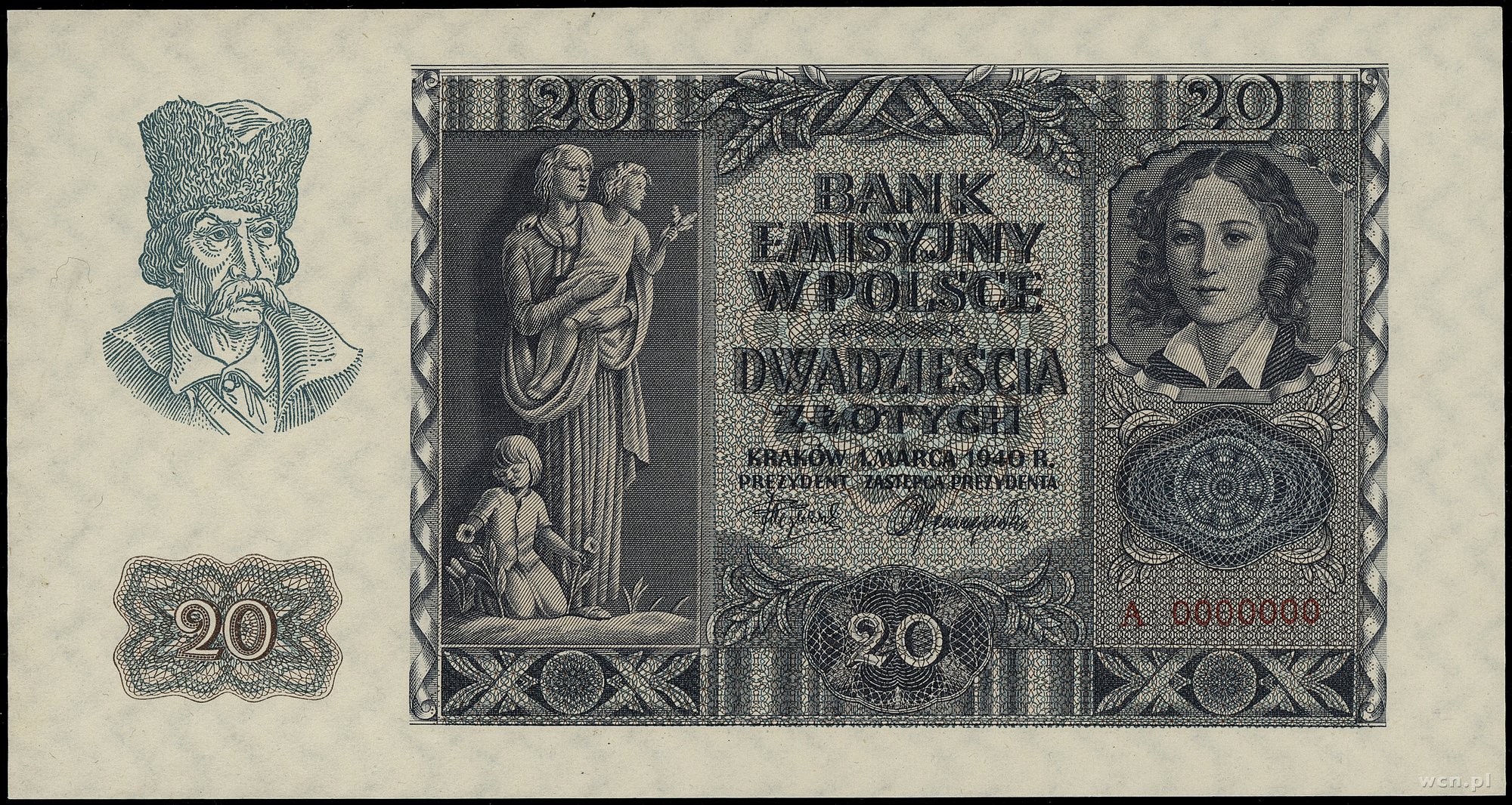 20 złotych, 1.03.1940; seria A, numeracja 0000000, bez perforacji i bez nadruków WZÓR; Lucow 784 (R6), Miłczak 95Wb; papier odświeżony, rzadki typ banknotu.