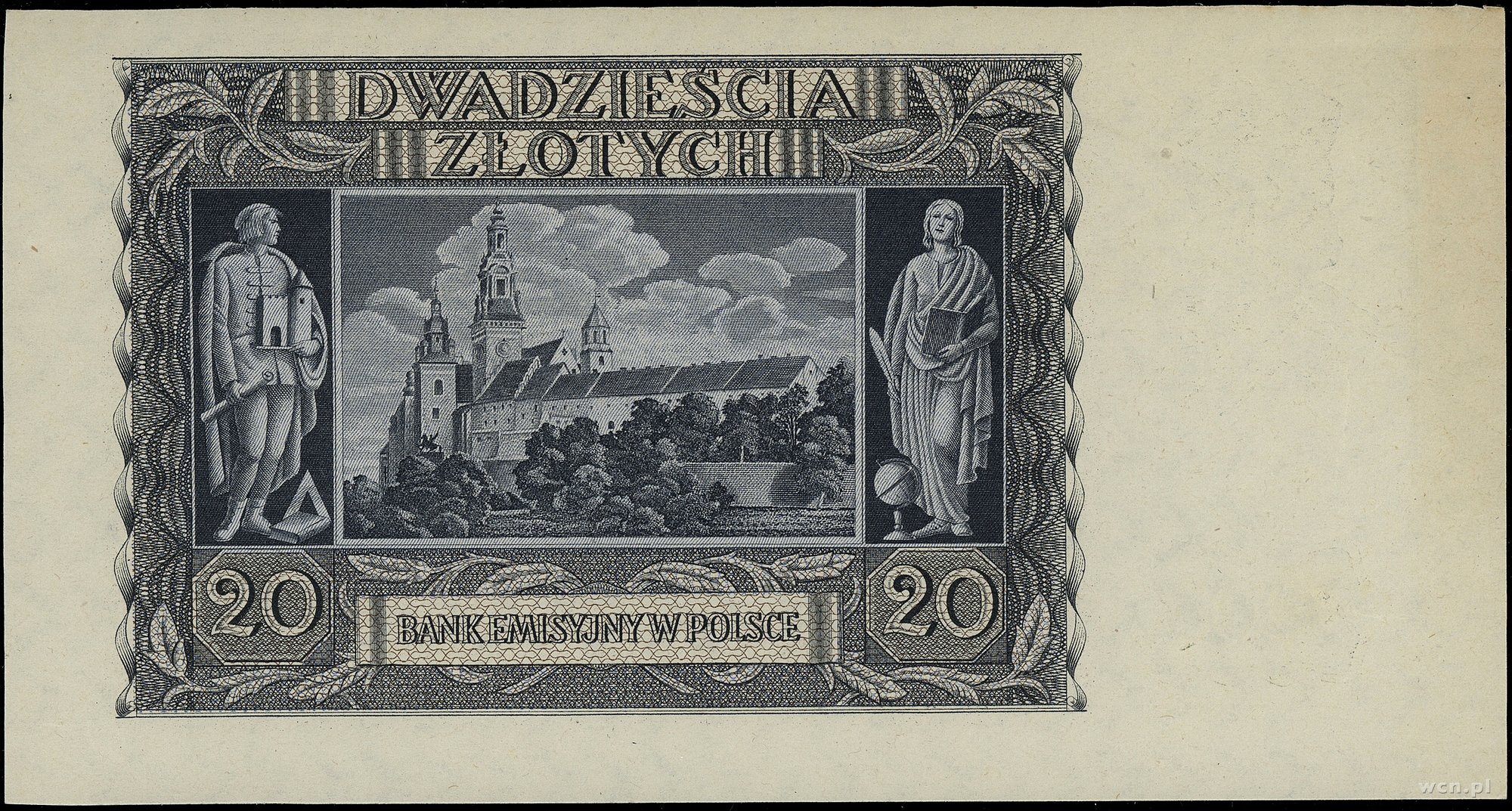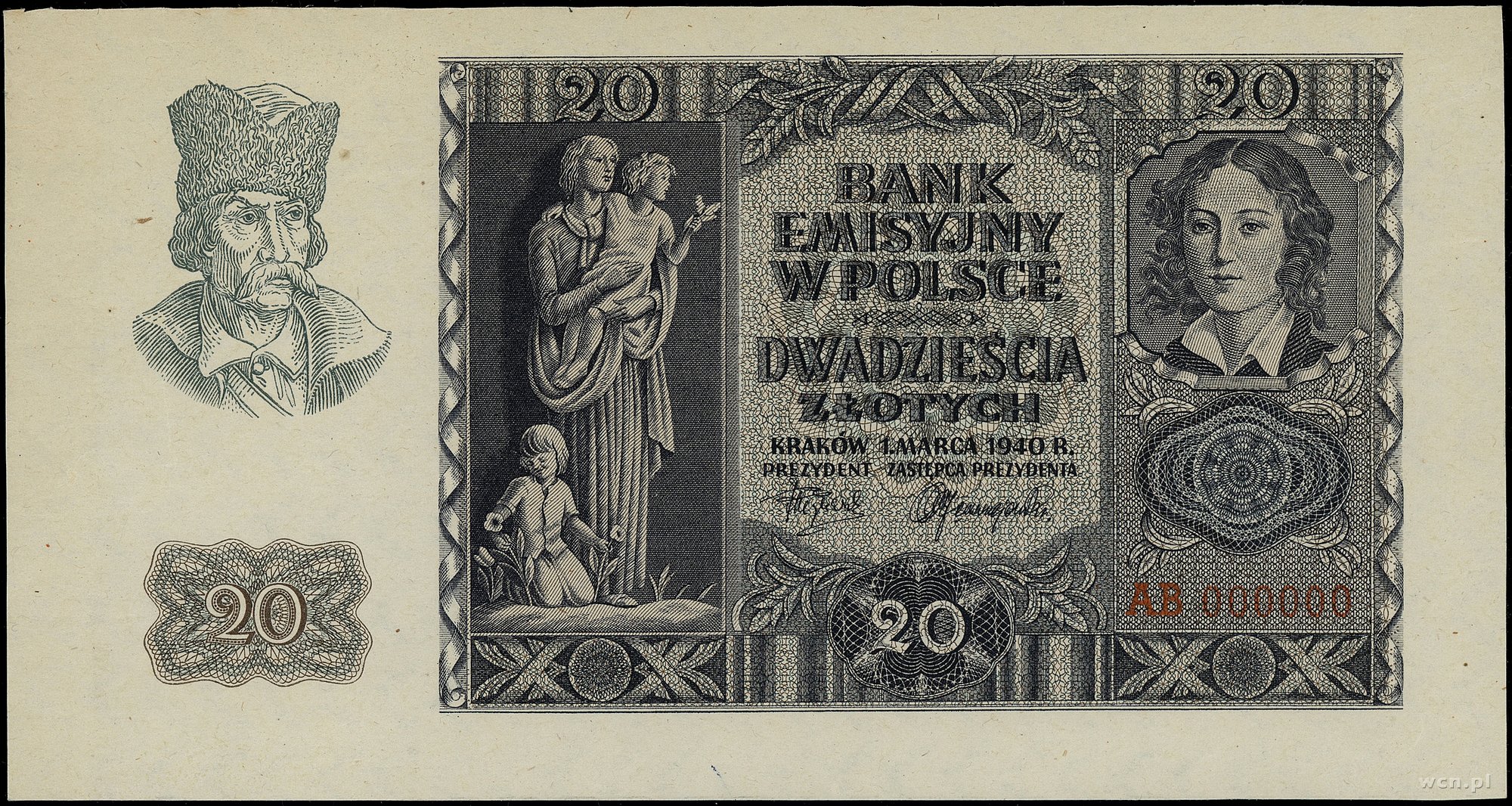 20 złotych, 1.03.1940; seria AB, numeracja 000000, bez perforacji i bez nadruków WZÓR; Lucow 785 (R7), Miłczak patrz 95Wb; zmarszczenie papieru, lewy margines odkleja..