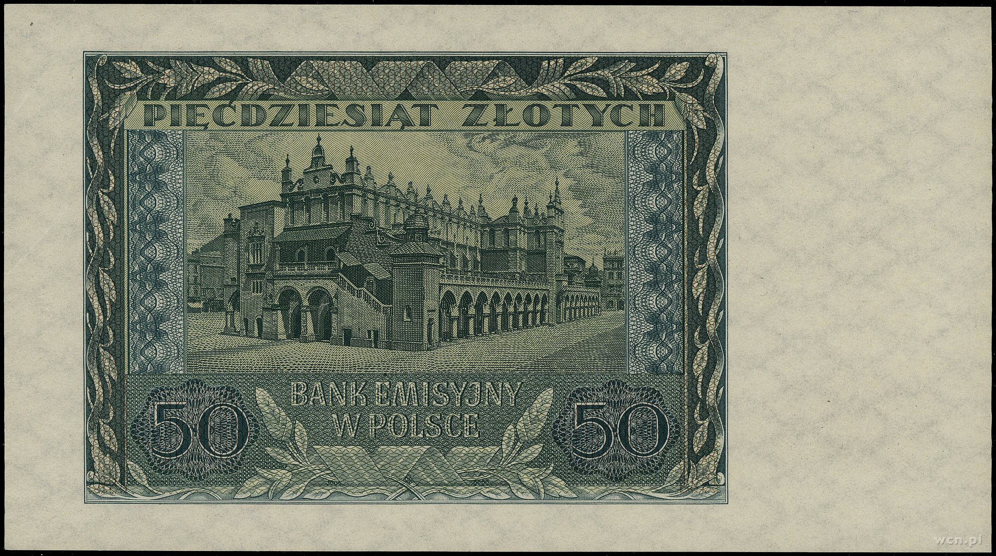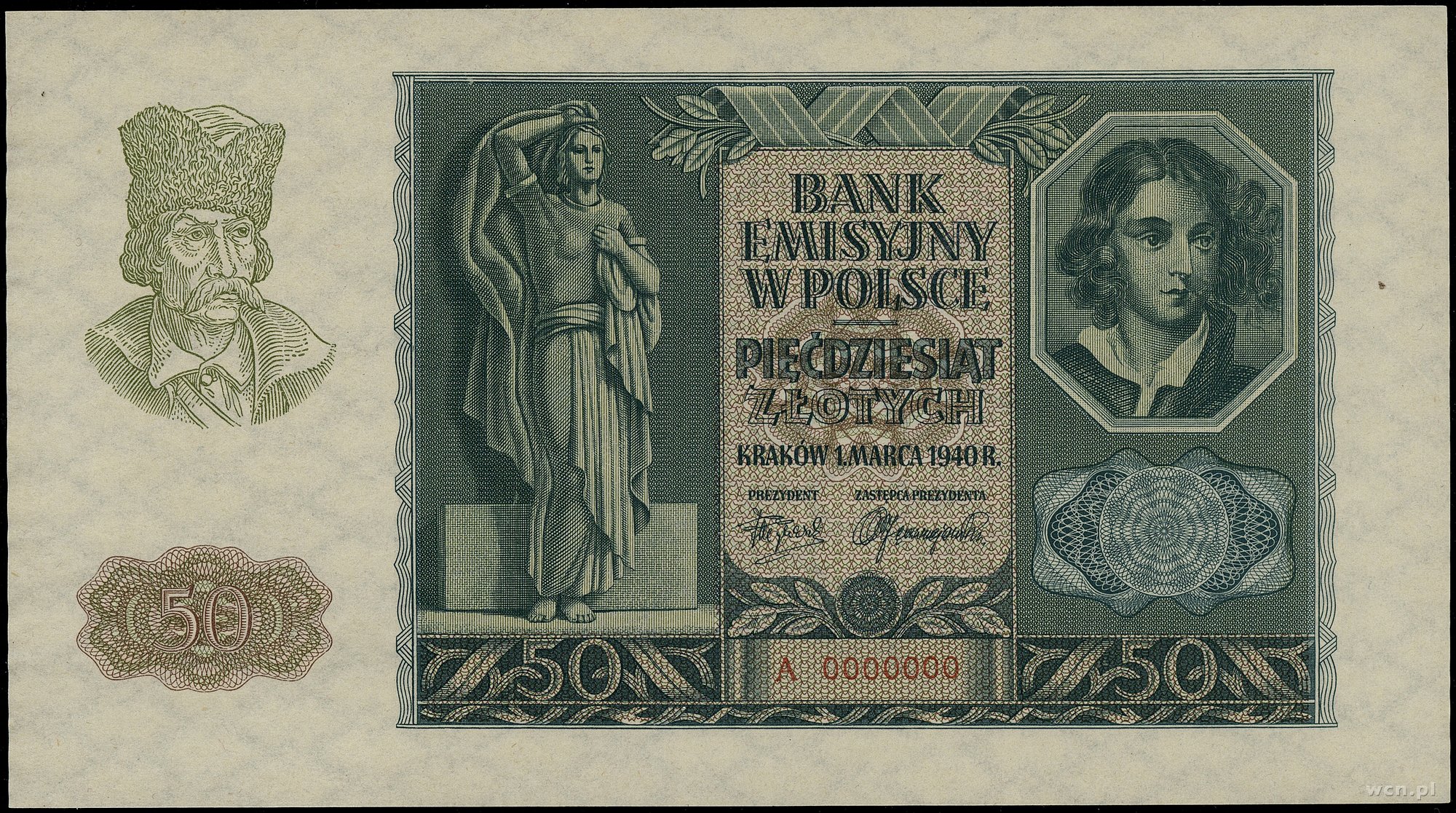 50 złotych, 1.03.1940; seria A, numeracja 0000000, bez perforacji i bez nadruków WZÓR; Lucow 789 (R6), Miłczak 96Wb; złamany lewy górny rożek, dwa ugięcia na prawym m..