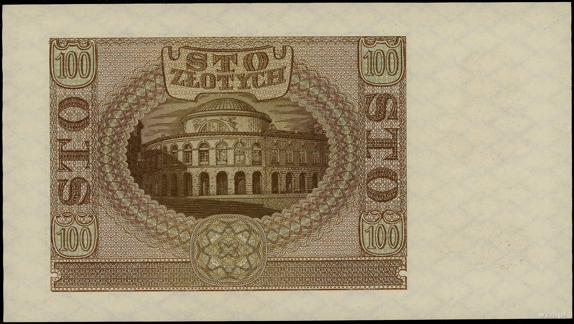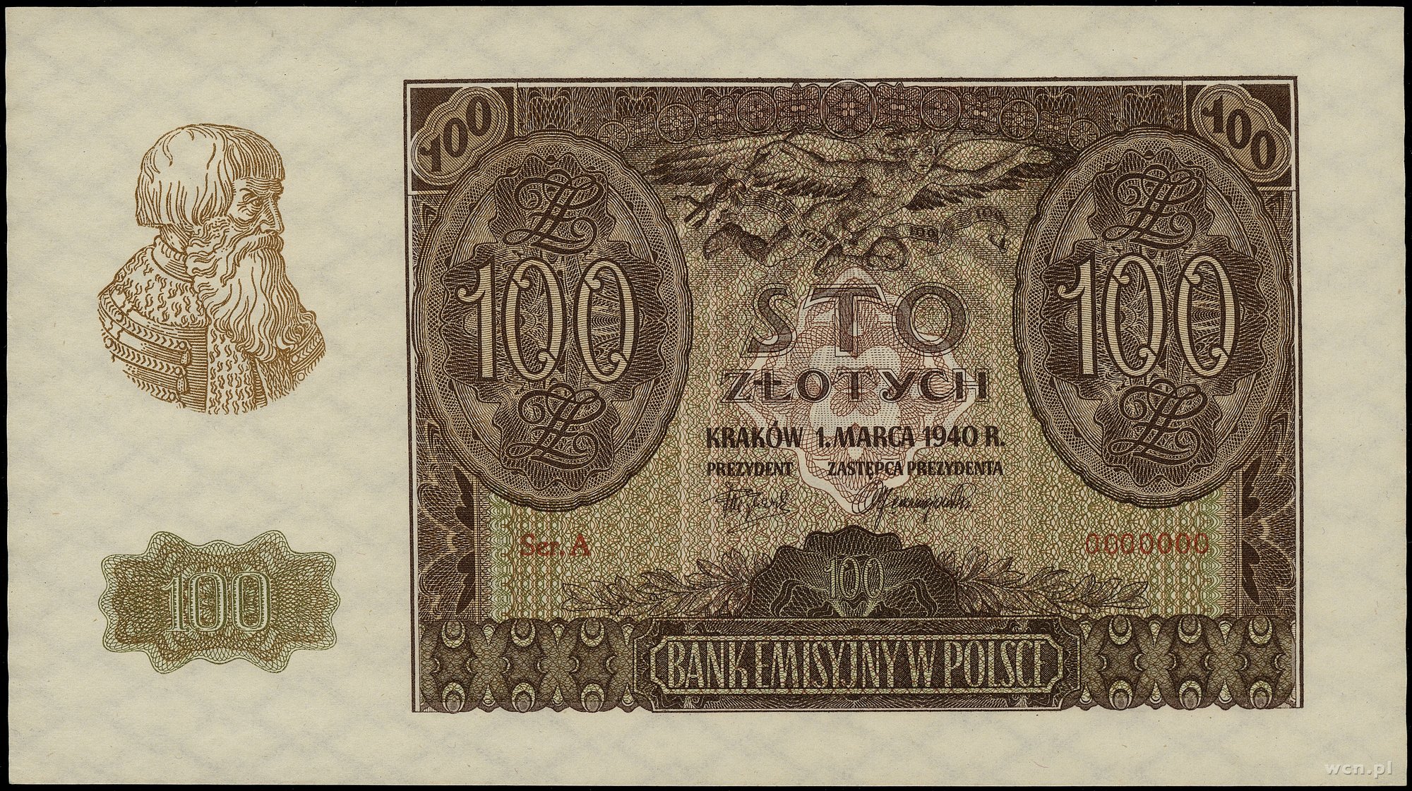 100 złotych, 1.03.1940; seria A, numeracja 0000000, bez perforacji i bez nadruków WZÓR; Lucow 792 (R6), Miłczak 97Wb; papier odświeżony, rzadki typ banknotu.